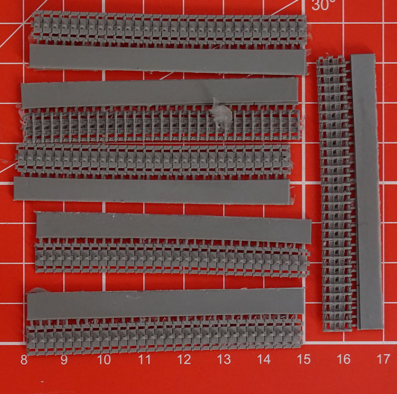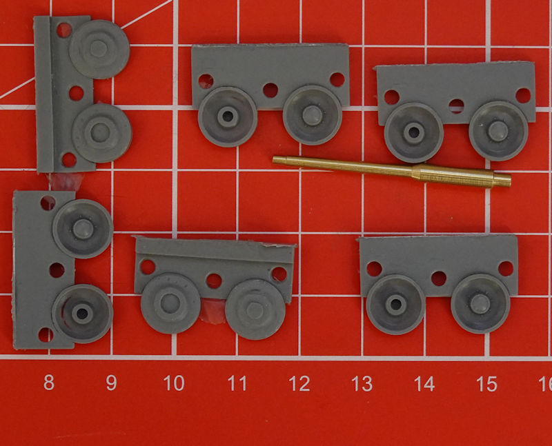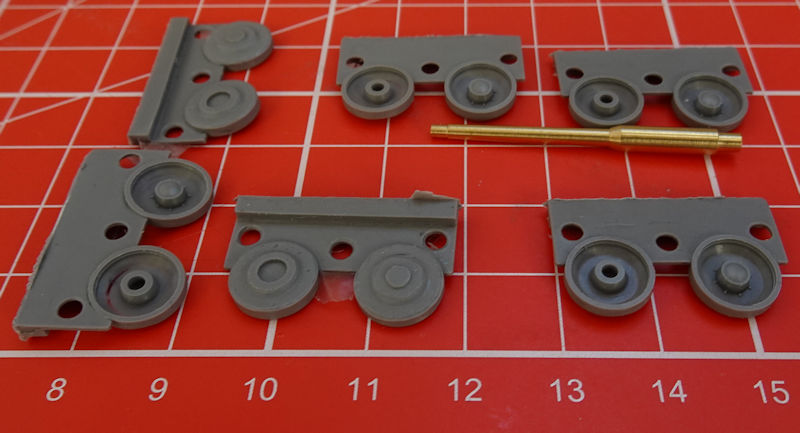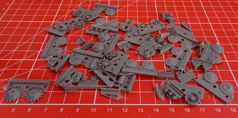 Das Kanonenrohr ist aus gedrehtem Messing und die Mündung ist aus Resin. Deren Mündung ist vorbildgerecht hohl. Beim Original war das Fahrwerk recht komplex und das hat OKB Grigorov sehr gut umgesetzt. Hier werden auch die meisten Teile verbaut. Da der Bausatz für Profimodellbauer gedacht ist, hat man die Zeichnungen dementsprechend zusammengefasst. Die fantastischen Resinketten mit den typischen Details gibt es als Segmente. Diese müssen entsprechend in Form gebracht werden.