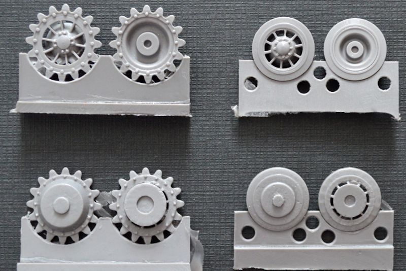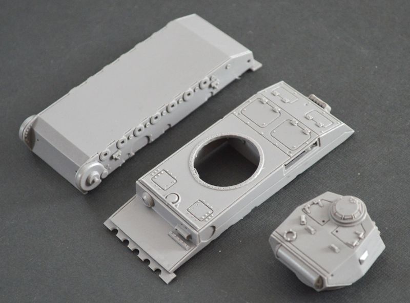 Bausatz: OKB Grigorov aus Bulgarien bietet bereits einige interessante Resin-Bausätze mit vielen Raritäten in 1:72 an. Darunter ist der Panzer VK. 3001 (H) erschienen. In einem stabilen Karton, in Polsterfolie geschützt, befinden sich insgesamt 96 graue Resin- sowie 20 Fotoätzteile und die Bauanleitung. Der Guss ist gut und sauber. Es gibt kaum Fischhäute und so gut wie keine Blasen. Die Angüsse sind äußerst klein gehalten. Recht flexibel ist das Resin, was beim Heraustrennen der Teile hilfreich ist. Der Bausatz wurde komplett am PC erstellt, weswegen die Detaillierung für 1:72 sehr gut ausfällt. Die Passgenauigkeit scheint bei ersten Proben ebenfalls zu stimmen. Meine Fotoätzteile sind leicht gebogen, was sich aber problemlos zurechtbiegen lassen sollte.