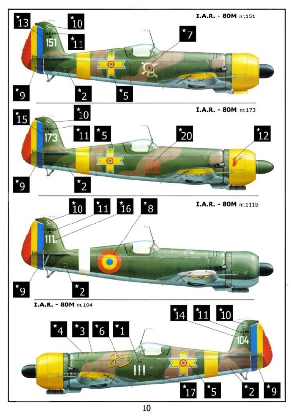 Die I.A.R. 80 wurde anfangs als Jagdflugzeug eingesetzt, später mit Kanonen bewaffnet, mit Zusatztanks versehen und als Jagdbomber mit Bomben. Die Jabo Variante hatte eine 250 kg Bombe unter den Rumpf und bis zu zwei 50 kg Bomben unter den Tragflächen. Alle diese Abwurflasten liegen selbstverständlich bei. Als Markierungsvarianten liegen drei Varianten mit Michaelkreuz (2. Weltkrieg auf Seiten der Achse) und eine Variante mit Kokarden bei.