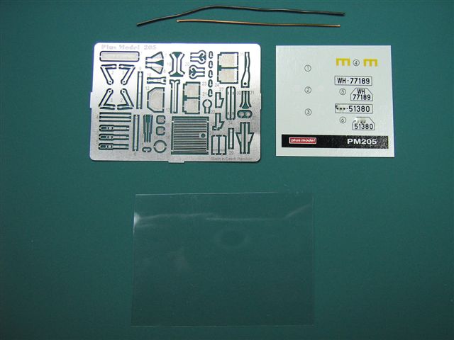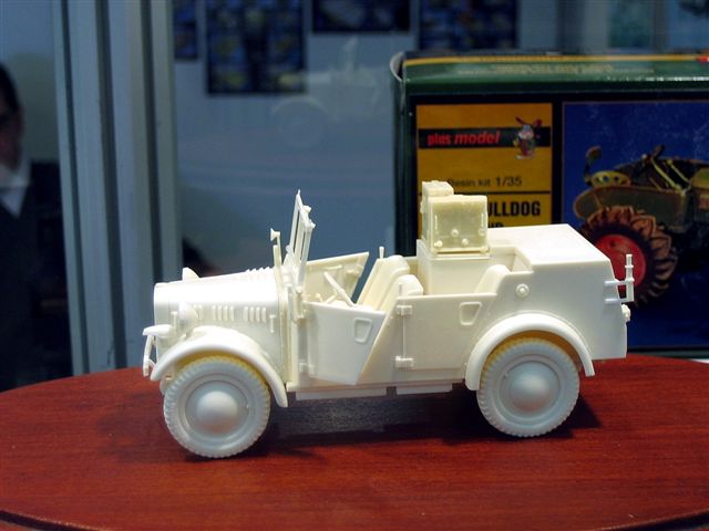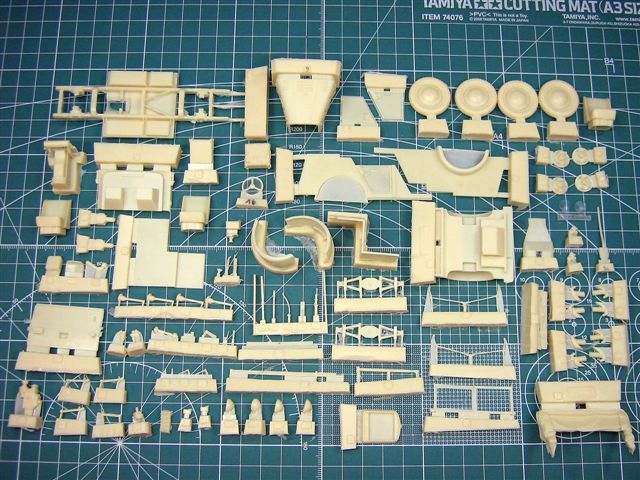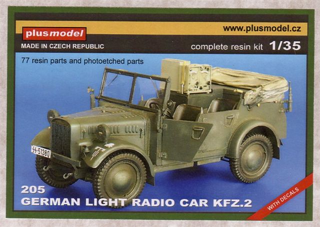 Zum Bausatz: Bereits als Vorabmodell auf der Nürnberger Spielwarenmesse 2006 vorgestellt, kam jetzt das komplette Resin Modell von Plus Model auf den hiesigen Modellbaumarkt. Sicherlich kein leichtes mehr in der heutigen Zeit, wo es die so genanten "Hightech" Plastikmodellbausätze gibt, noch einen Resinmodell Bausatz für ca. 69,- Euro (MODUNI Shop) herauszubringen. Aber wer die Modelle vom tschechischen Hersteller kennt, wird immer mit einem Top Produkt belohnt. So befinden sich im Bausatz mehr als 100 sauber gegossene Resinteile, die durch eine Teilenummernangabe auf dem Gießansatz leicht zuzuordnen sind. Ferner enthalten sind mehr als 50 Fotogeätzte Teile, Rundmaterial in zwei stärken, ein kleiner Decalbogen, Klarsichtmaterial für die Windschutzscheibe und die Bauanleitung. Anhand der übersichtlichen Bauanleitung (die auch ausreichende Farbangaben enthält) wird der Zusammenbau keine Schwierigkeiten bereiten. Im Vergleich zu dem Anfang der 90er Jahren erschienenden SMA Resin Modell liegt der neue Plus Model Kit klar vorne, man erinnert sich nur an die zu kleinen Räder und die verzogenen Zinnteile des SMA Kits. Auch wenn es heute schon klasse Bausätze in Plastik-Spritzguss gibt, ist es doch immer wieder schön wenn noch fehlende Fahrzeuge in sehr guter Resin-Qualität erscheinen.