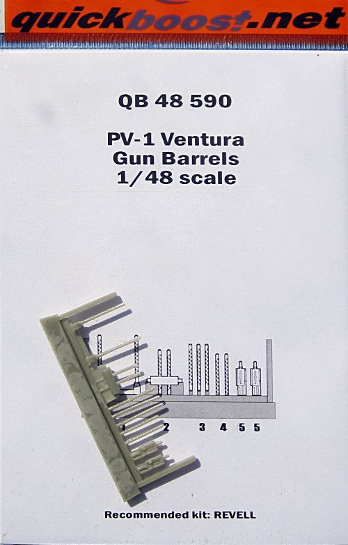 Für Revells 1/48er PV-1 Ventura (Review) sind bereits ein ganze Reihe von Zubehörsätzen erschienen. Auch Quickboost hat sich des Bausatzes angenommen und verschiedene Detailsätze in Resin herausgebracht. Dieser kleine aber feine Satz ersetzt die Läufe aller Abwehrwaffen des Revell-Modells der Ventura. Nach gedrehten und gefrästen Rohren ist dies wohl die beste Methode diese Waffen am Modell darzustellen.