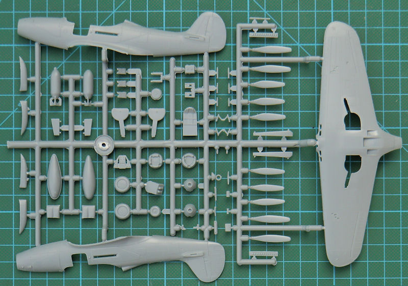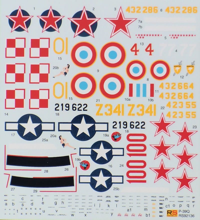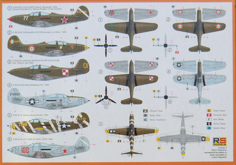 Bausatz: Es ist nur zu verständlich, dass RSmodels aus Tschechien auch eine P-39Q herausbringt. Diese letzte Serienversion erlangte zum Ende des WK II eine große Verbreitung. In der attraktiven aber unpraktischen Schüttbox befinden sich gut verpackt zwei graue Spritzgussrahmen mit 91 Teilen, einen Klarsichtrahmen mit fünf Teilen, drei Resinteile, einen Decalbogen und die gut gemachte Bauanleitung.