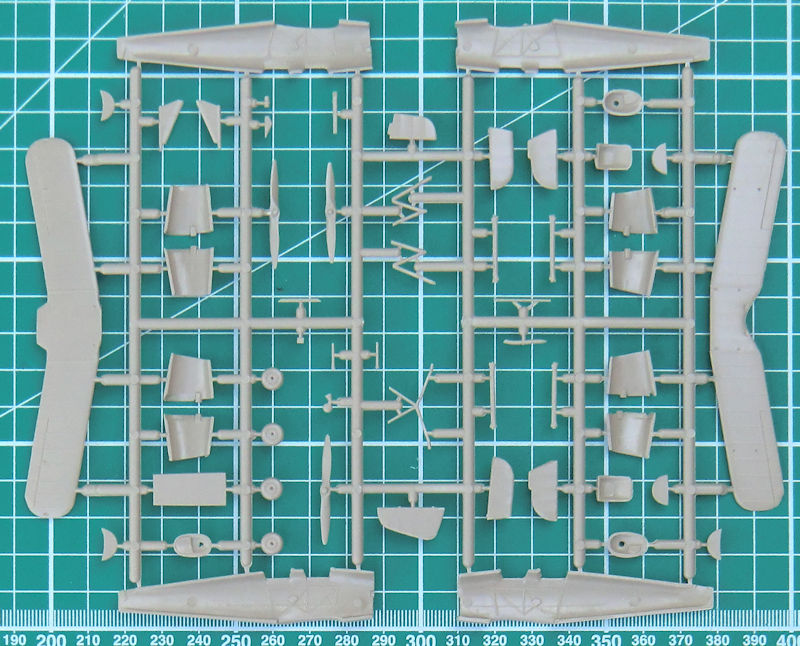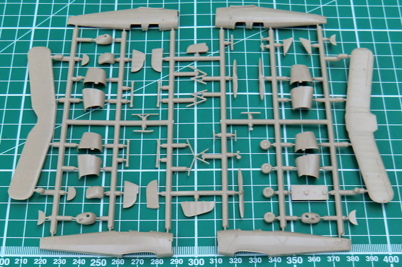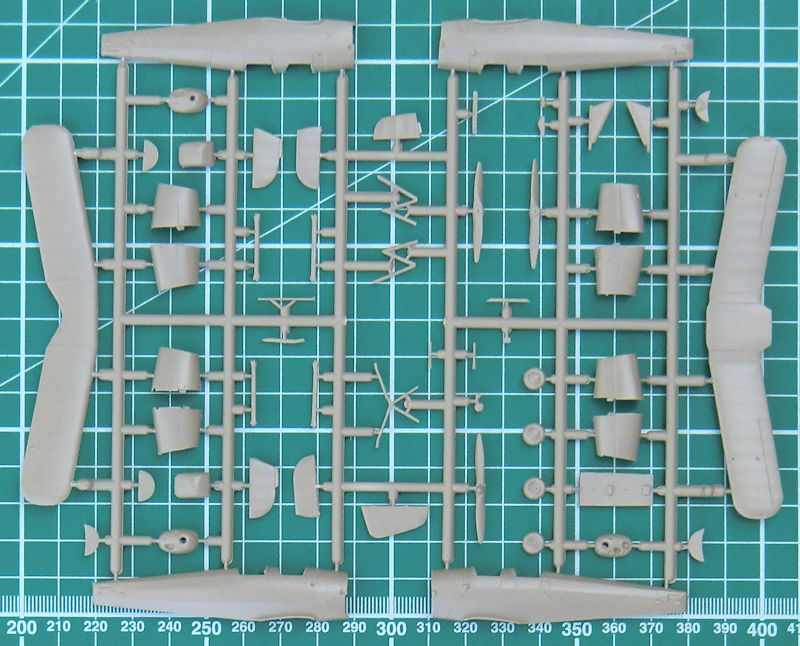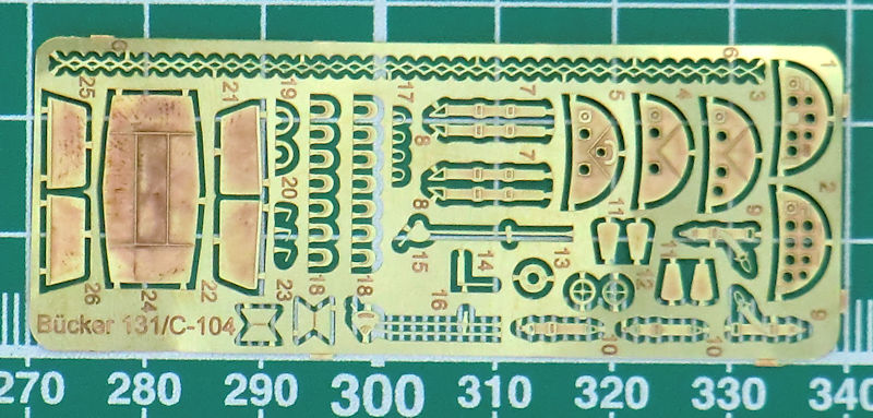 In der typischen attraktiven aber unpraktischen Schüttbox von RSmodels befinden sich gut verpackt ein hellgrauer Spritzling mit 63 Einzelteilen, ein Fotofilm, ein Fotoätzteilbogen und die Bauanleitung. Einige Teile sind für andere Versionen gedacht und wandern in die Restekiste. Die Abspritzung der Bauteile ist sehr gut. Die bespannte Struktur der Bücker hat man hier sehr gut umgesetzt.