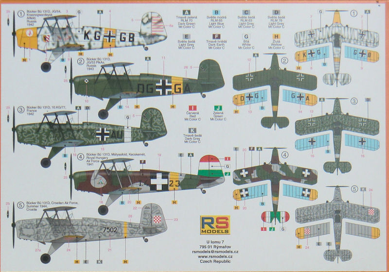 Bausatz: Die Bücker Bü 131 gab es Ende der 1980er Jahre schon als Spritzgussbausatz in 1/72. Damals hatte sich das kleine deutsche Unternehmen HUMA mit diversen deutschen Vorbildern aus den 1930er und 1940er Jahren beschäftig und diese als Bausatz auf dem Markt gebracht. Leider ist das Unternehmen vom Markt verschwunden. So folgte 2009 CMR mit einem Resinbausatz für fortgeschrittene Modellbauer und nun RSmodels mit mehreren Spritzgussbausätzen zum Thema Bücker Bü 131.