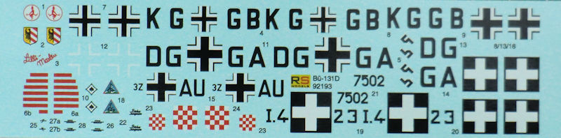 Bei den Bemalungshinweisen gibt RSmodels die RLM-Farbtöne an. Der Decalbogen ist tadellos auf hellblauem Trägerpapier gedruckt. Es gibt auch ein paar Wartungshinweise.