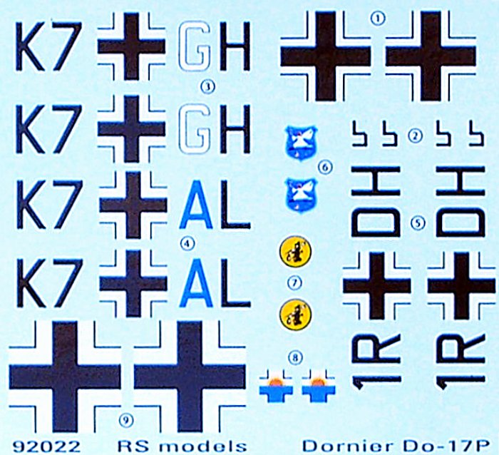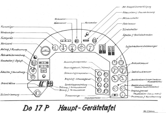 Bausatz: Der Bausatz der Do 17 P ist fast identisch mit dem Bausatz der Do 17 M, der einzige Unterschied sind die Decals. Deshalb verweise ich auf die sehr ausführliche Bausatzbesprechung der Do 17 M von Volker Helms. Die sehr einfache Bauanleitung bezieht sich nur auf die "P"-Teile und geht nicht auf die vorhandenen "M"-Teile ein. Für den Bau einer korrekten Hauptgerätetafel siehe beigefügte Zeichnung.