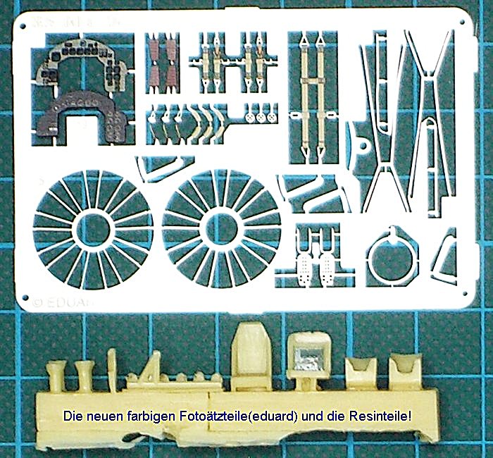 Die hervorragend gemachte Box (leider eine Schüttbox) hat auf der Rückseite keine Bemalungsanleitung. Da hat die Druckerei schlichtweg den Film vergessen. Daher gibt es die Bemalungsvariante auf einem separaten Blatt! Die Fotoätzteile sind jetzt bei Eduard erstellt worden. Sie sind zum Teil farbig bedruckt und es sind auch Sitzgurte (auf die die Bauanleitung leider nicht eingeht) vorhanden. Schön! Leider kann man diese nicht separat nachordern.