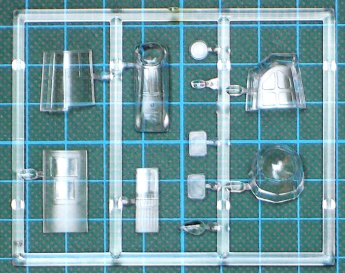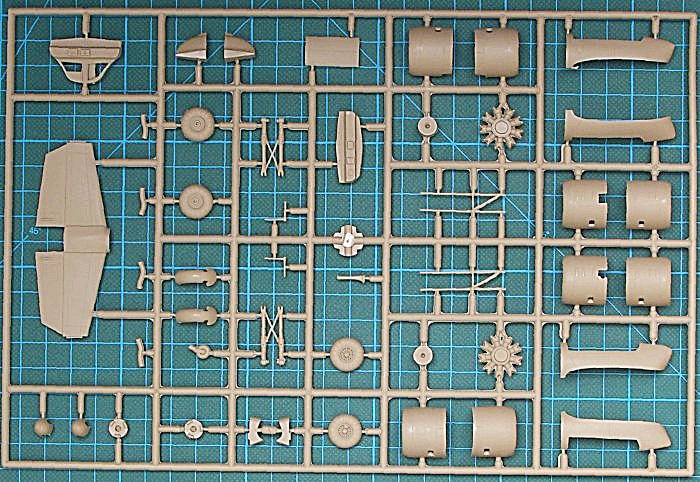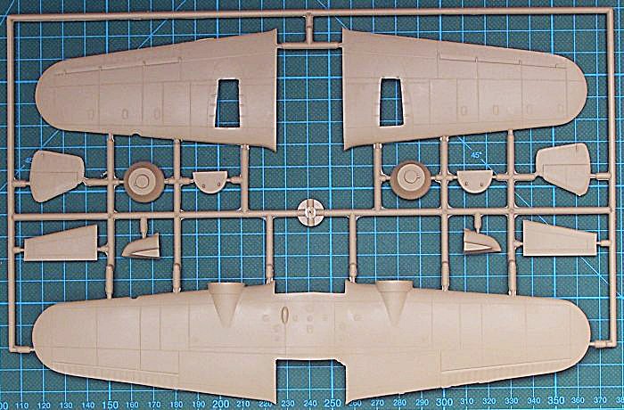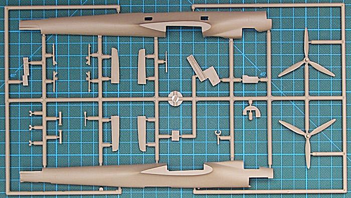 Der dritte Spritzling enthält die für den Rumpf, ein paar Kleinteile für das Cockpit, die Luftschrauben und weitere Kleinteile. Die MGs wirken ein wenig klobig. Interessanterweise gibt es hier auch noch mal ein Instrumentenbrett aus Kunststoff. Nicht berücksichtigt hat RSmodels, dass die Instrumentenbretter bei der M- und P-Version leicht unterschiedlich sind. Die beiden Einstiegstüren sind erhaben wiedergegeben. Im Modell mag es ein Effekt sein wie bei den Wartungsklappen. Im Original war hier alles bündig. Ein paar Gravuren hätten es in diesen Falle auch getan. Schön sieht es trotzdem aus. Weniger schön sind allerdings die Auswerfermarkierungen in der Kabine. Hier hilft nur schnitzen und feilen/schleifen.