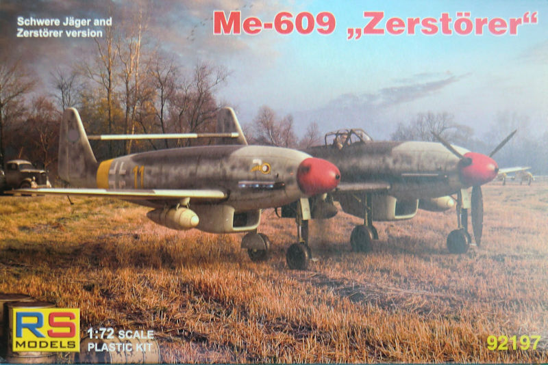 Bausatz: Wie schon früher HUMA brachte RSmodels nach der Me 309 auch die Me 609(ohne Bindestrich übrigens) in 1/72 heraus. In der attraktiven aber unpraktischen Schüttbox befinden sich gut verpackt fünf Spritzgussrahmen mit 156 Teilen, eine Spritzgusskanzel, ein Decalbogen und die Bauanleitung.