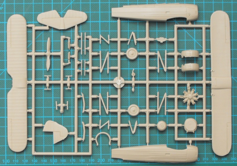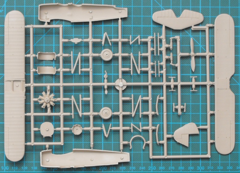 Der Motor aus Spritzgussmaterial ist ausreichend detailliert. Er wird z.T. durch eine mehrteilige Motorverkleidung und einen kleinen Spinner verdeckt. Nicht ganz einfach ist die Montage der Tragflächen. Hier sollte eine Lehre bzw. Montagehilfe zum Einsatz kommen. Für die richtige Ausrichtung der Streben gibt es eine Skizze. Wer sich dann noch an der Verspannung versuchen möchte, der kann diese ebenfalls nutzen und auf das Bausatzcover zurückgreifen. Die Decals sind versatzfrei auf hellblauem Trägerpapier gedruckt.