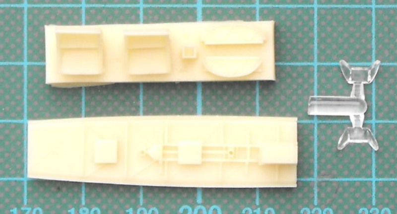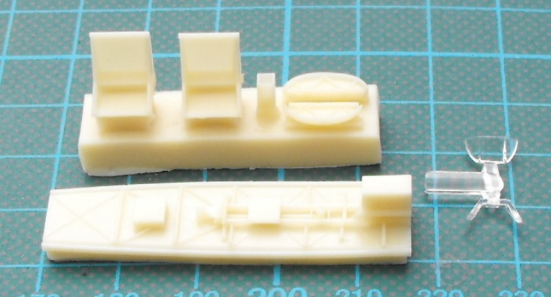 Das Cockpit entsteht aus einem Gemisch von Resin- und Spritzgussteilen. Allerdings gibt es einen Kontrast von der hochdetaillierten Grundplatte zu den kargen Seitenwänden der Rumpfteile. Die Instrumente werden mittels Decals auf zwei Resinteile aufgebracht und so dargestellt. Zwei Steuerknüppel und zwei Resinsitze ergänzen das Cockpit. Vermisst habe ich hier ein paar Sitzgurte.