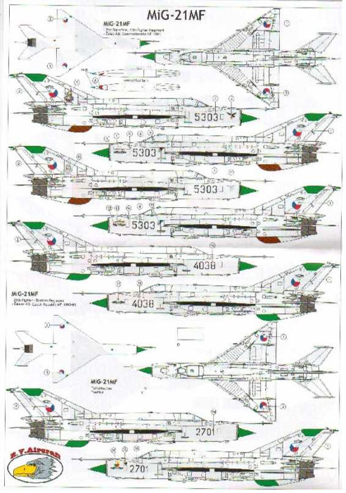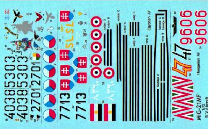 Bemalungsvarianten: Neben drei tschechischen MF kann man auch noch je eine slowakische, ägyptische oder ungarische MiG-21MF bauen