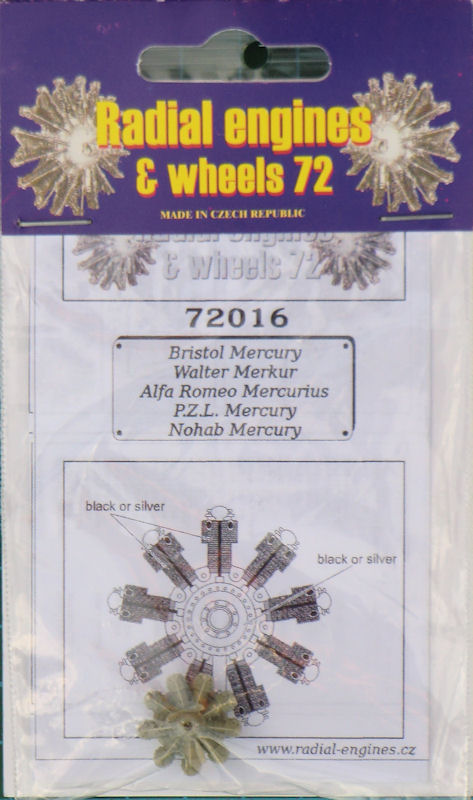 Bausatz: Radial engines & wheels aus Tschechien liefert in einer kleinen Tüte einen perfekt in einem Stück gegossenen Mercury. Dazu gibt es eine Skizze mit Bemalungshinweisen. Auf deren Rückseite gibt es eine Liste mit allen Flugzeugmuster, die diesen Motor als Antrieb nutzten.
