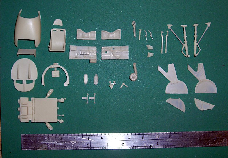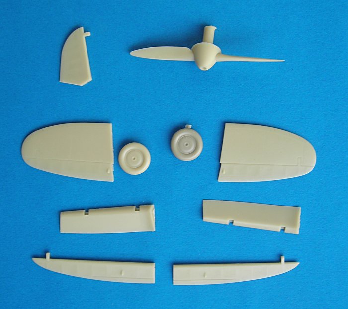 Der Bausatz: Wenn man den recht kleinen Karton öffnet, fallen einem zunächst der Flügel und der Rumpf auf. Beide sind einteilig gegossen und wirken auf den ersten Blick recht robust. Ein näheres Hinsehen lohnt sich jedoch und macht deutlich, dass es sich hier um ein Resinmodell der Spitzenklasse handelt. Ich hoffe ich kann dem Modell gerecht werden und den Farbauftrag so dünn halten, dass die Gravuren nicht zugekleistert werden. Daneben sind noch mehrere kleine Beutel mit Steuerflächen, Kühler, Fahrwerk und Cockpit-Teilen enthalten. Die sehr dünnen Streben haben einen Draht eingegossen (perfekt!) und die Fahrwerksklappen sind dünner als Papier ... ich frage mich, wie man so etwas hinbekommt, einfach toll. Für den Führerraum liegen auch eine kleine Ätzteilplatine mit Fotonegativ und zwei Vaku-Teile für den Windschutz bei.