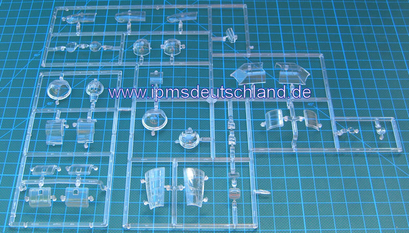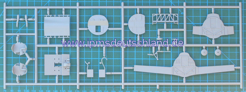 Es gibt einen großen Rahmen mit Klarsichtteilen und acht Spritzlinge mit fein detaillierten Bauteilen. Diese sehen schon sehr final aus. Man hat sogar mal an die jeweils zwei Panzerplatten unterhalb des Cockpits auf jeder Seite gedacht. Diese sind natürlich nicht maßstäblich reproduzierbar. Revell hat jedenfalls ein Optimum gefunden. Wem es nicht reicht, der soll ein Schleifpad nutzen.