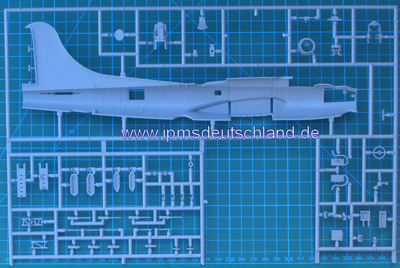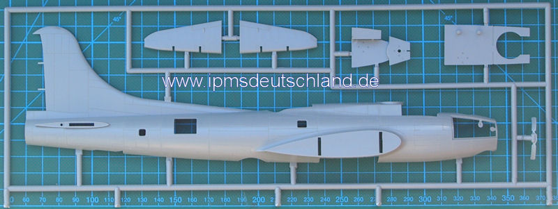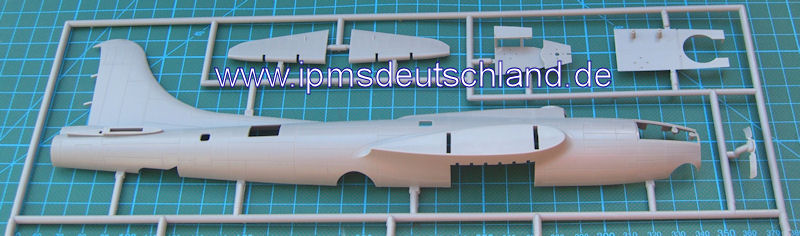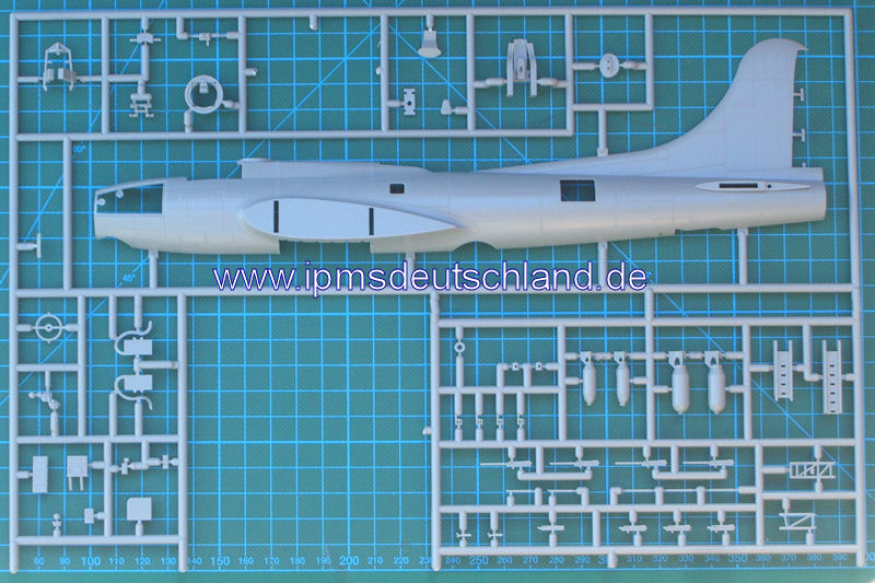 In der Folge kann dieser Bausatz weiter begeistern. Es gibt stabile Holme zur Befestigung der Tragflächen und auch innen ist der Rumpf nicht leer. Neben den feinen Strukturen gibt es auch genug Details an den Schotts. Alle Ruder sind bei ordentlichen Spaltmaßen beweglich montierbar. Die fest angespritzten Landeklappen besitzen auch innen eine Struktur. Gleiches gilt natürlich auch für den Bombenschacht nebst Klappen. Revell liefert auch den frühen Heckstand mit und am Bug sind die versionstypischen Teile austauschbar. Gut gefällt mir der Sperry-Abwehrturm. Hier gibt es eine ordentliche Einrichtung und Alternativen dafür!