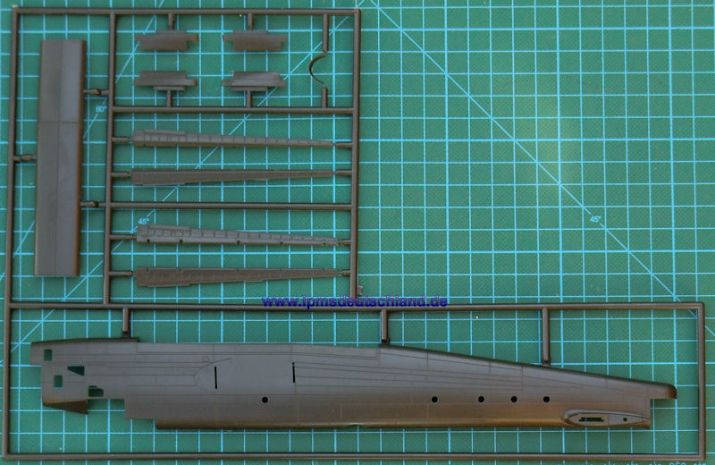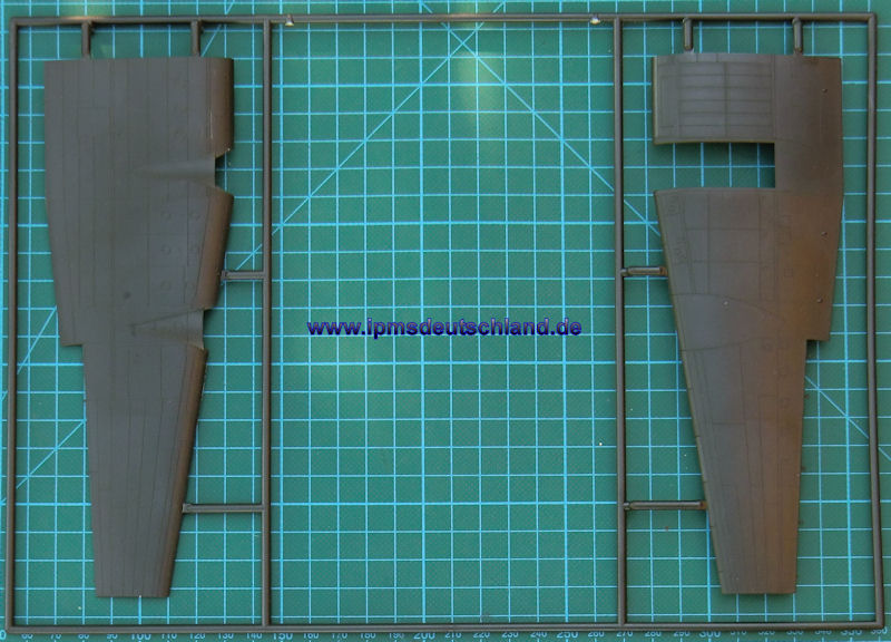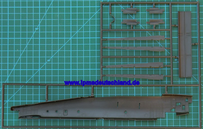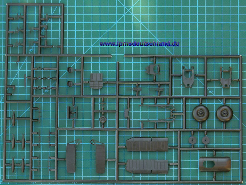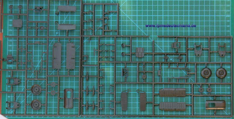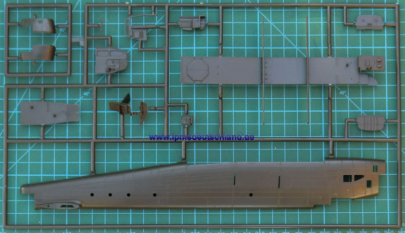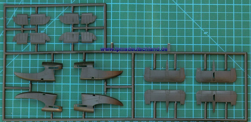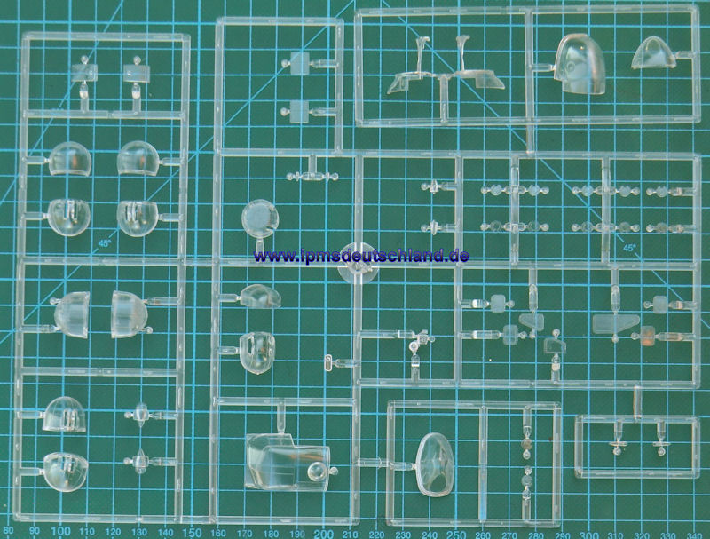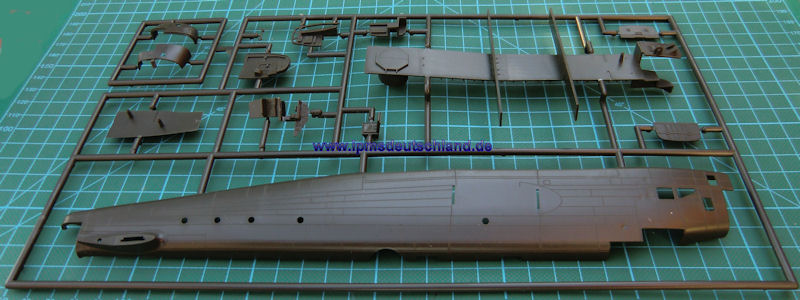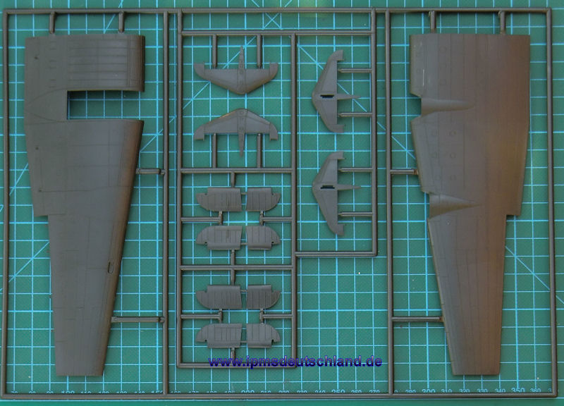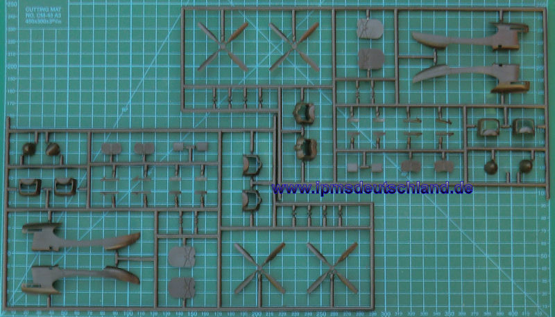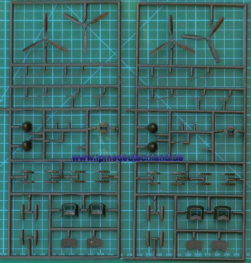 Es gibt 155 Einzelteile. Diese verteilen sich auf zwölf farbige Spritzlinge sowie einen Klarsichtrahmen. Revell versucht hier alle Variationen der Mk. I und Mk. II mit abzudecken. So gibt es drei verschiedene Lufteinläufe für die Merlin-Triebwerke, Drei- oder Vierblattluftschrauben und unterschiedliche Seitenruder.