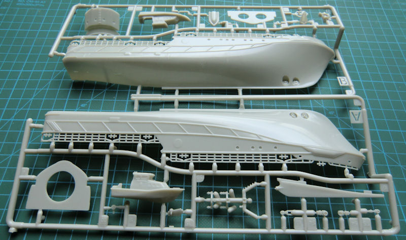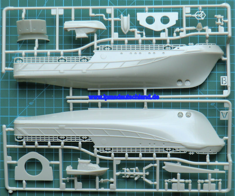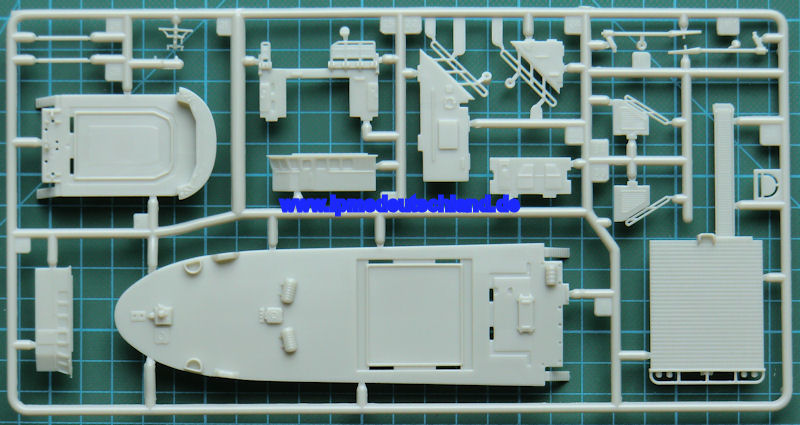 Die Teile besitzen viele Details. Hier sind gegenüber dem 72er Bausatz einige Baugruppen zusammengefasst und damit wurde die Montage vereinfacht. Alle Öffnungen für Fenster/Bullaugen sind nicht durchbrochen. Wer hier tätig werden möchte, der kann das leicht tun.