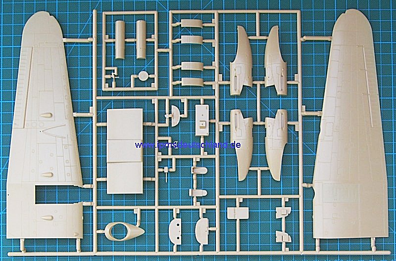 Spritzlinge: Es gibt nichts, was man nicht besser machen kann. Das hat man sich im Hause Revell Deutschland in Bünde auch gesagt und so hat man dort eine neue Avro Lancaster (1/72) in der Entwicklung. Der erste Eindruck ist hervorragend obwohl bei den vorliegenden Spritzlingen noch nicht alle Details endgültig sind. Das betrifft vor allem das Cockpit. Hier sind die Details schon recht schön. So gibt es erhabene gravierte Instrumentenbretter. Auch die Rumpfseiten im Besatzungsraum sind mit Paneelen versehen. Das sieht echt toll aus. Die Waffenstände sind gut reproduziert. Im Rumpf wird ein massiver Holm verarbeitet auf dem die Tragflächen dann nur aufgeschoben werden.