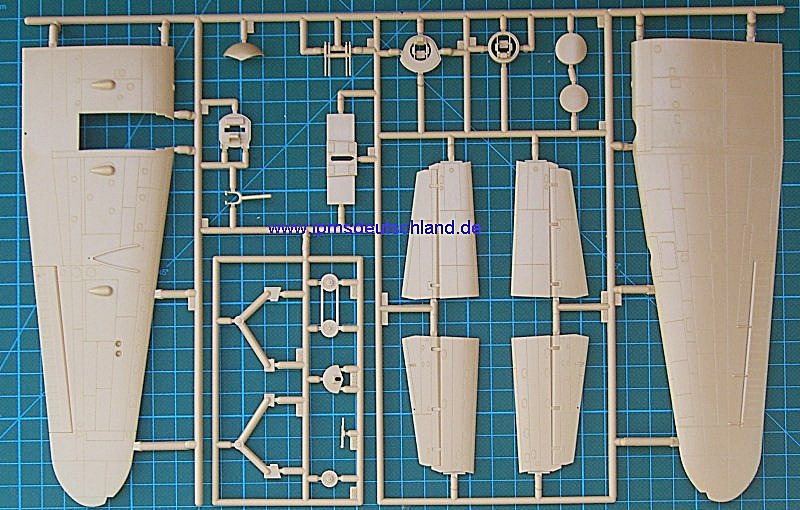 Die Fahrwerksschächte sind sehr tief (an der Tragflächenoberseite bis an die Grenze des Machbaren bei der Materialstärke) und sehr detailreich. Hier gibt es plastische Seitenteile. Alternativteile gibt es bei den Luftschrauben. Sehr überrascht haben mich die Kühler der Merlin-Motore, die in Einläufe integriert wurden. Sie sind sehr gut und vor allem richtig wiedergegeben. Beim Mitbewerber sind die Konturen der Einläufe viel zu rund und die Kühler nur mit gleichmäßigen erhabenen Gravuren dargestellt? Die Hauptfahrwerksräder wirken wie im Original schlicht. Ich persönlich hätte mir hier leicht abgeplattete Reifen gewünscht.