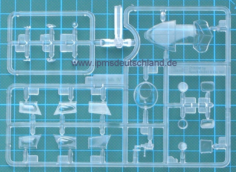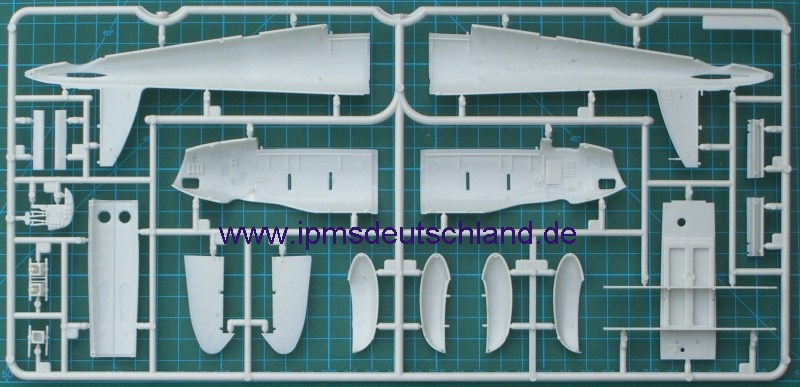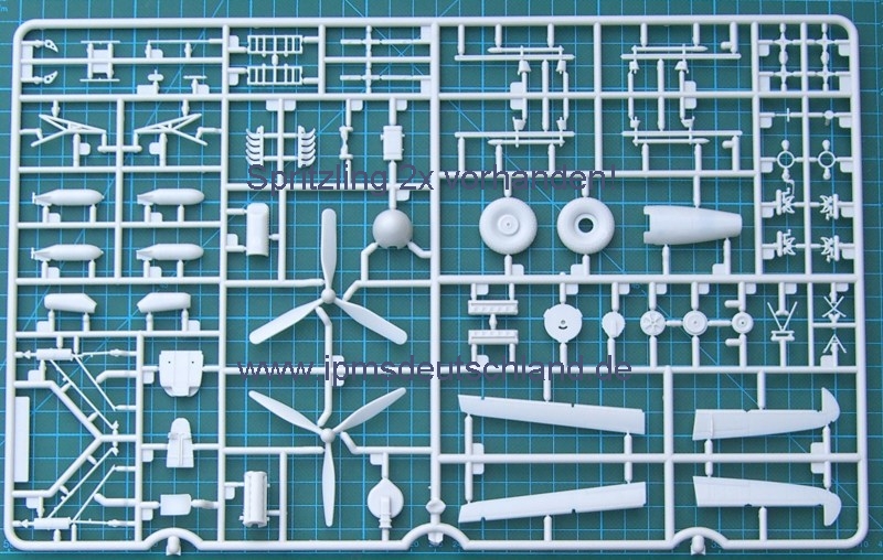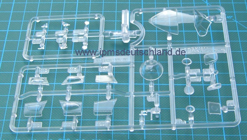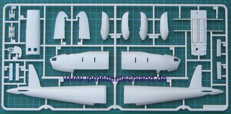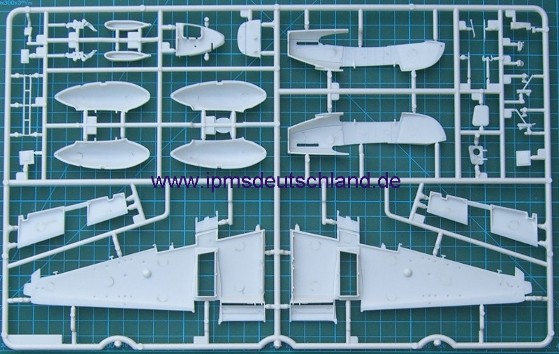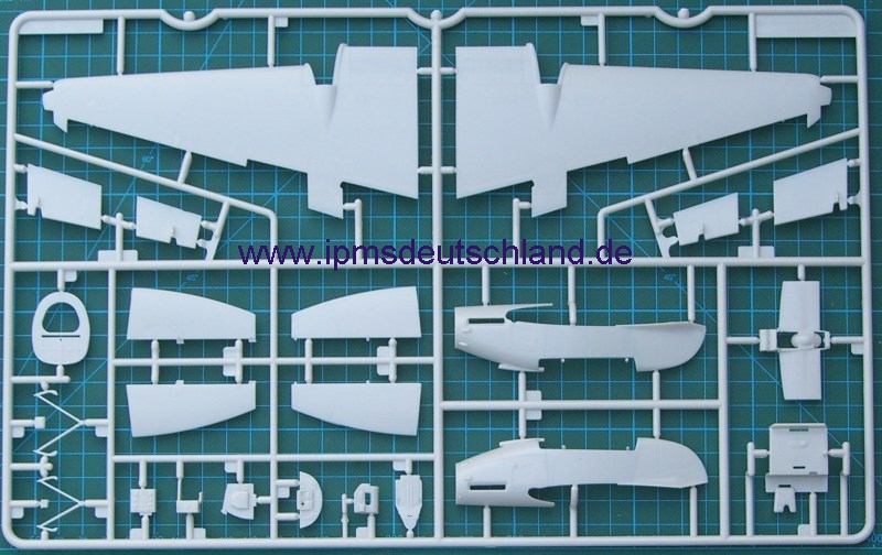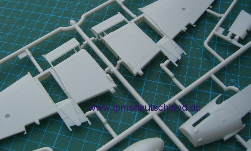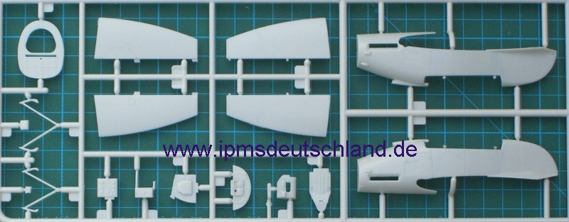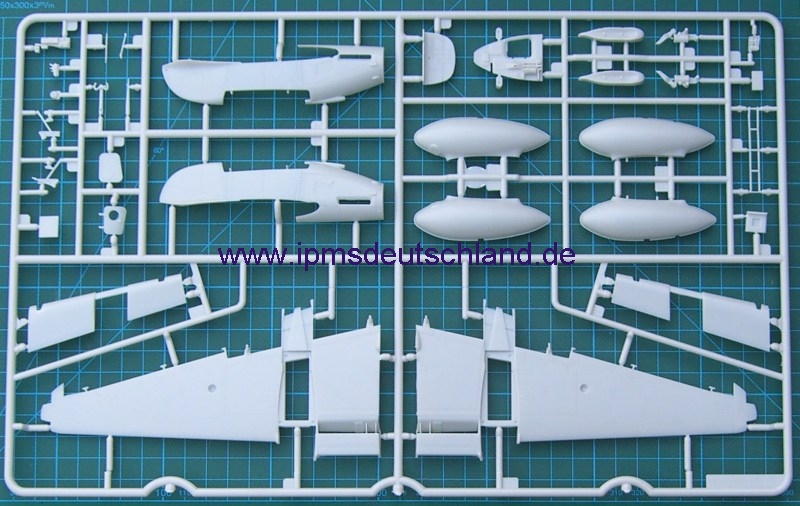 Schaut man sich die Bauteile an, so fällt sofort auf, dass sicher noch weitere Versionen folgen werden, denn der Bausatz ist sehr modular aufgebaut. Selbst die Tragflächen lassen die Möglichkeit offen, auch einen kurzen Fahrwerksschacht zu montieren. Zwei verschiedene Luftschrauben gibt es auch…