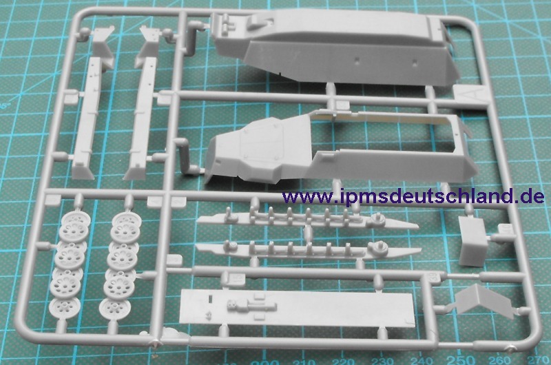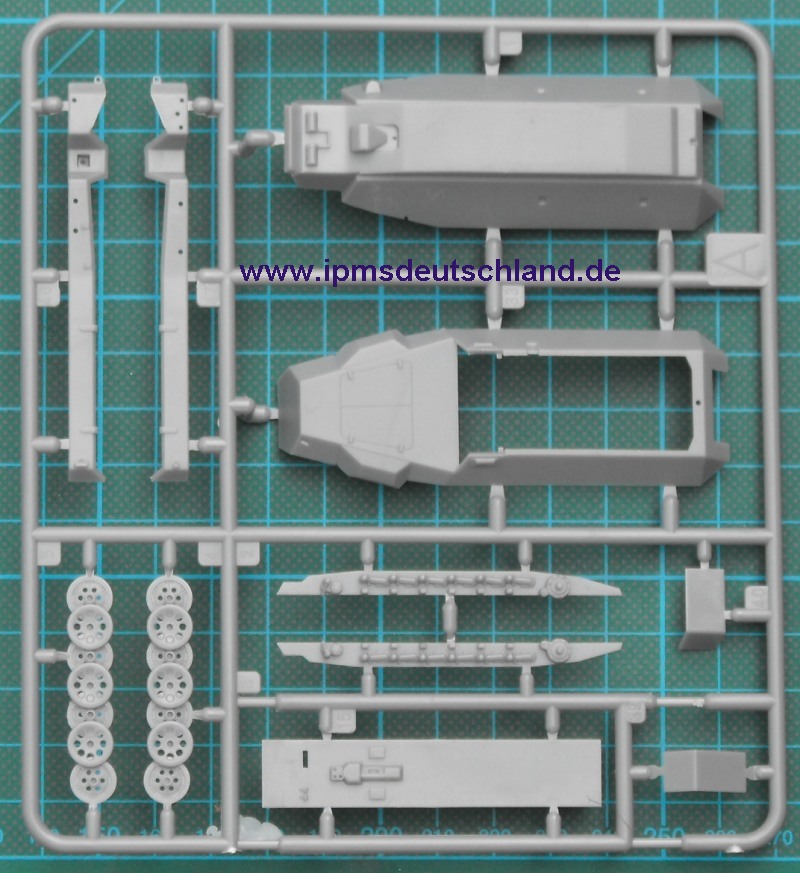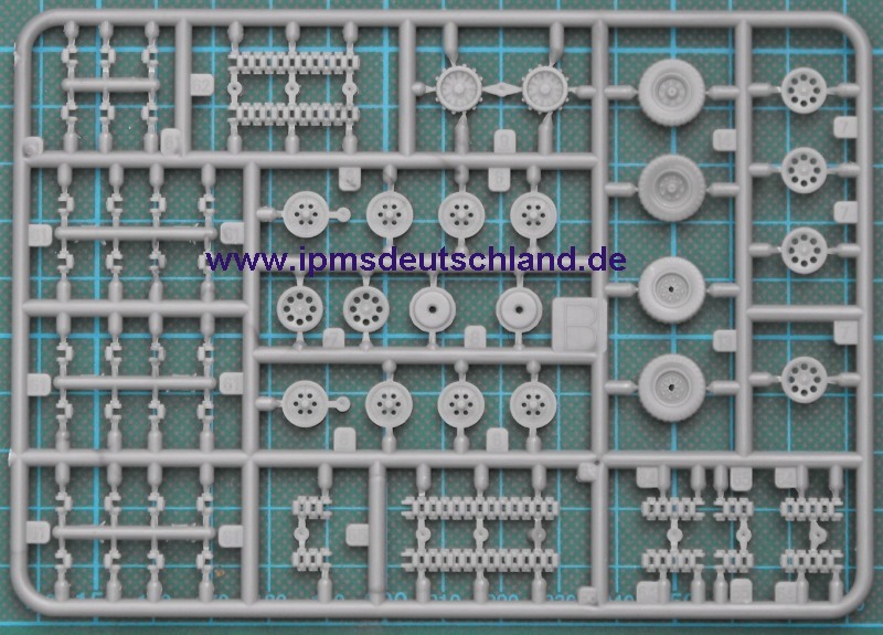 Die Bauteile verteilen sich auf vier Spritzlinge. Das Schachtellaufwerk ist ähnlich aufgebaut wie beim Bausatz von Dragon. Es besteht aus jeweils einem komplexen Teil. Gelungen sind die Gravuren für Klappen. Separat liegen die Hecktüren bei. Diese können in offener oder geschlossener Position montiert werden. Die Vorderachse entsteht aus drei Bauteilen und die Räder aus jeweils zwei Hälften. Aus mehreren Segmenten setzt sich die Kette zusammen.
