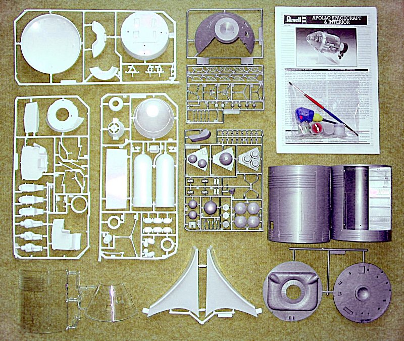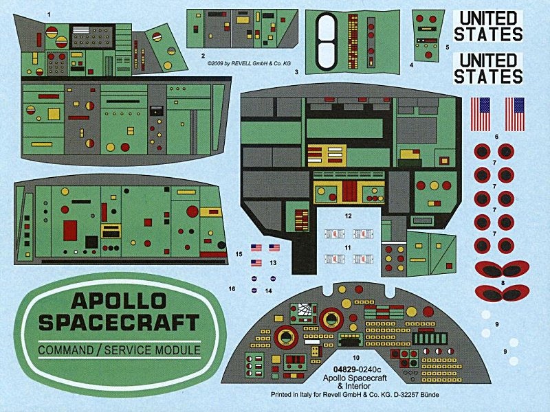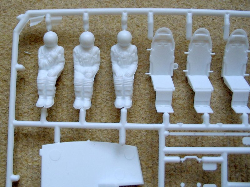 Der Käufer bekommt hier ein ziemlich großes Modell des Orbiters mit gefälliger Inneneinrichtung. Durch ein in klarem Plastik gespritztes Wandungsteil bietet sich ein faszinierender Blick in die Raumkapsel mit der dreiköpfigen Crew in ihren Sitzen, Tanks und Steuermodulen. Ein sehr ausführlicher Decalbogen, der unter anderem die kompletten Bedien-Panele beinhaltet, liegt dem Modell bei. Auf dem mitgelieferten Sockel, bestehend auch zwei Teilen, kann das Modell später gut präsentiert werden.