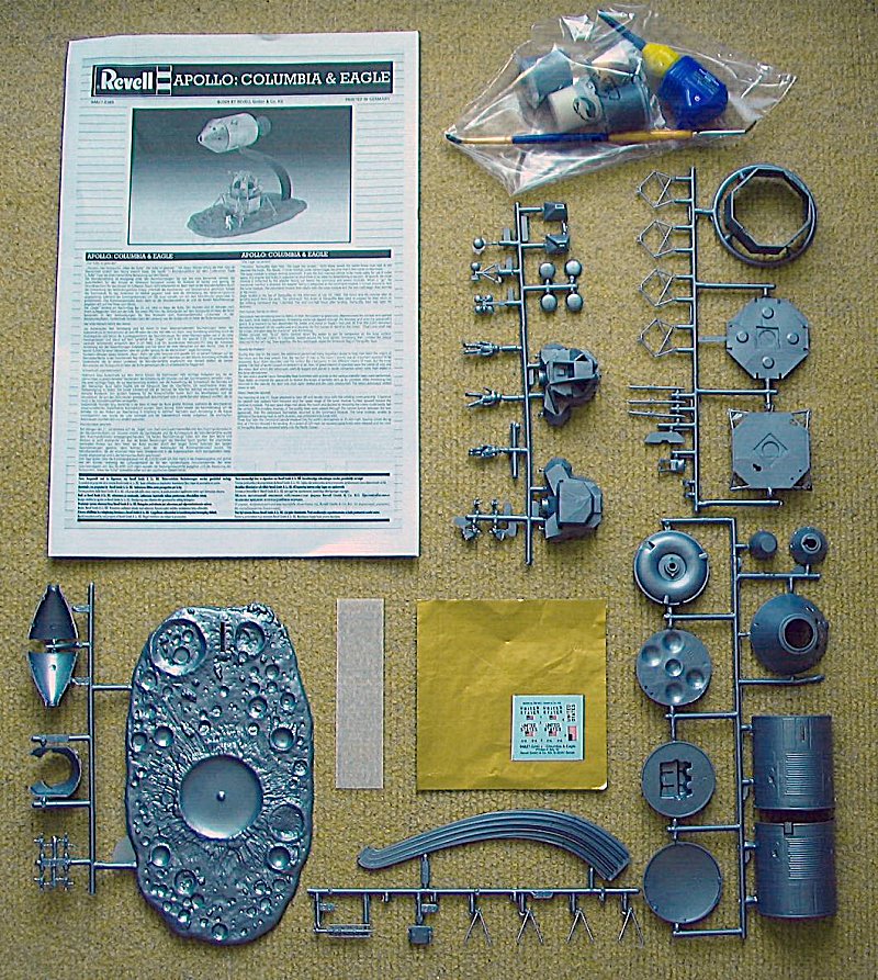 Das Modell beinhaltet die Rakete selbst mit kleinem Startsockel, den Orbiter Columbia, die Eagle, Moonbase mit Astronaut und die Rückkehrkapsel.