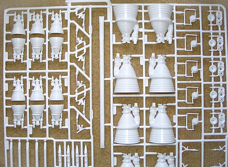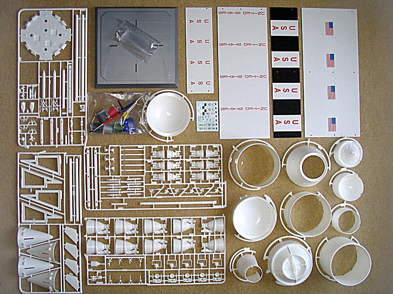 Wer den alten Bausatz nicht kennt, wird zuerst vergeblich nach den großen Wandungsteilen der Saturn V suchen und sich wundern, nur die Zwischenringe und Schubdüsen vorzufinden.