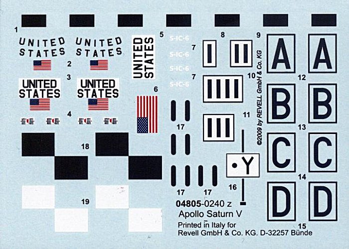 Auf dem kleinen Decalbogen finden sich einmal die Aufnäher des Anzuges von der NASA, die Flagge der USA und Wartungshinweise für das Lebenserhaltungssystem.