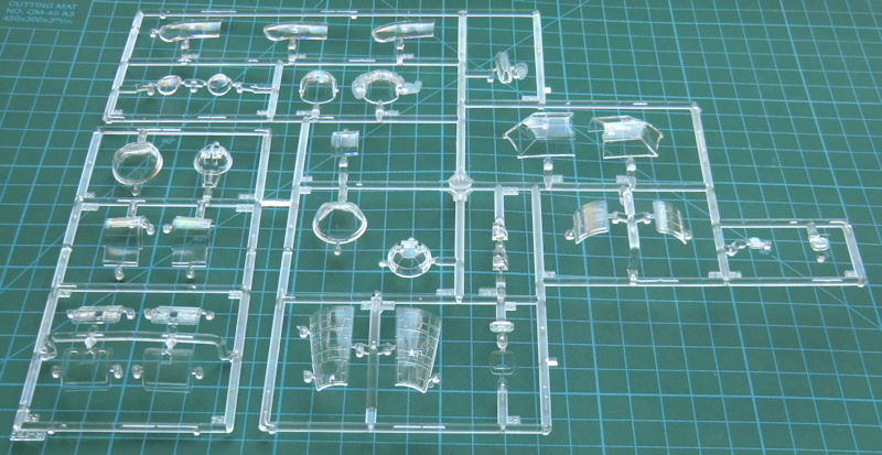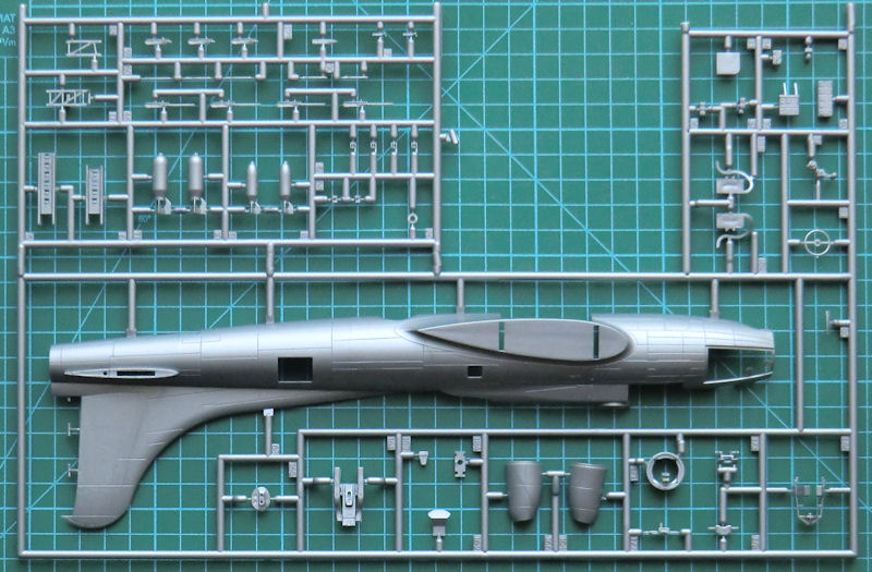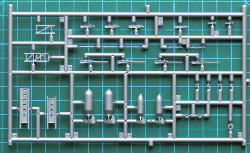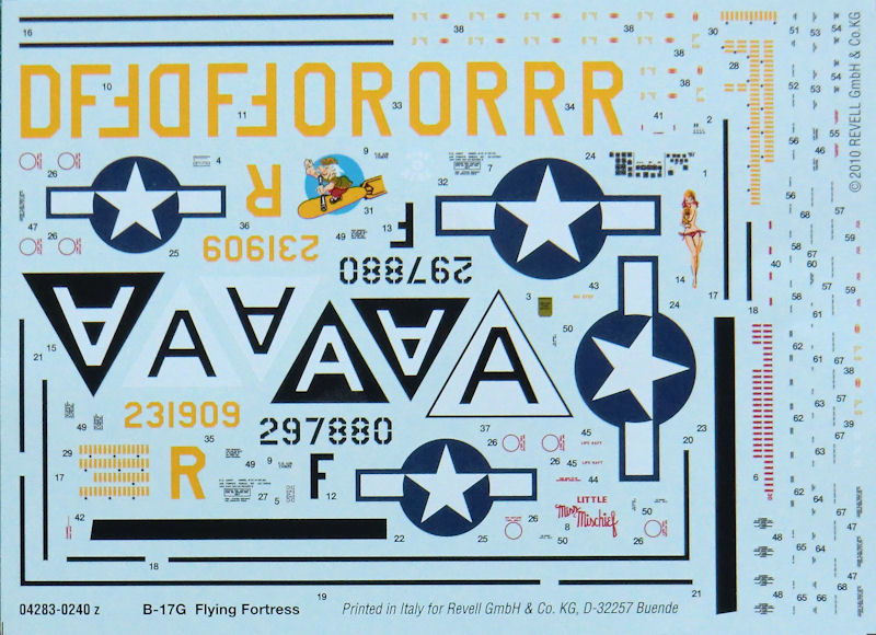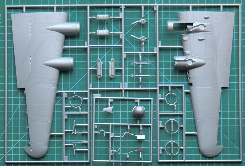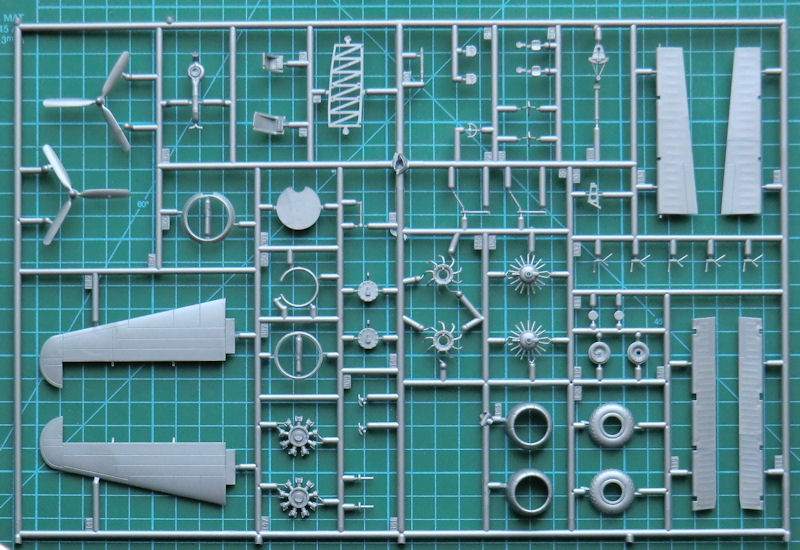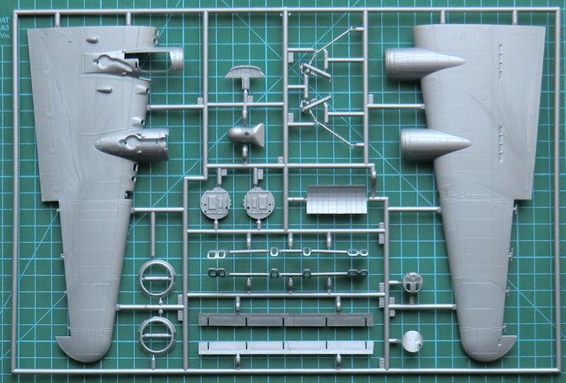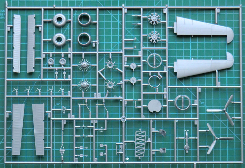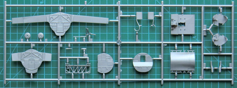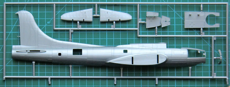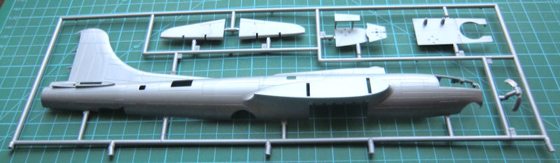 In der attraktiven aber absolut unpraktischen Schüttbox befinden sich gut verpackt neun silberfarbene Spritzlinge mit insgesamt 207 Teilen, ein Rahmen Klarsichtteile mit 30 Teilen, ein Decalbogen und die übersichtliche Bauanleitung. Die Detaillierung der Bauteile ist hervorragend und auf der Höhe der Zeit. Schwächen des Kits sind im Tragflächenprofil und im Seitenleitwerk. Diese fallen aber nur Freaks auf. Trotz dieser Schwächen halte ich den Bausatz für die beste B-17G in 1/72!