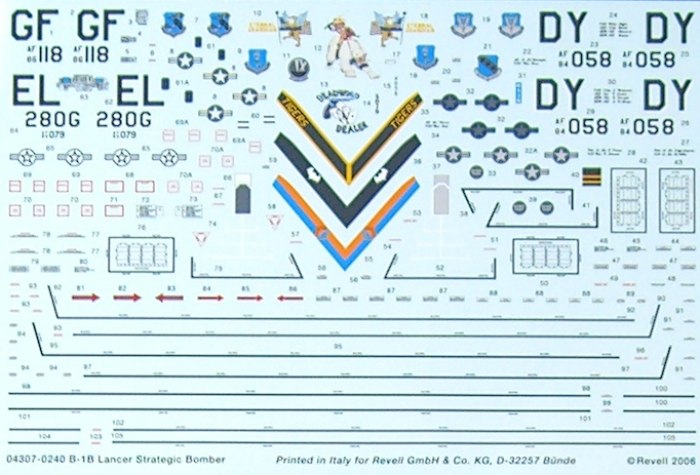 Bausatz: 1983 erschien erstmals bei Monogram eine B-1B. Dieser Bausatz wurde seit dem wieder aufgelegt. Er ist nicht frei von Schwächen. So ist er 1/75 in der Länge und 1/74 in der Spannweite. Die fertige B-1B ist also etwas zu klein. Nimmt man das Erscheinungsdatum und vergleicht es mit den Daten des Originals, dann wird schnell klar, dass hier die Prototypen als Vorbild dienten. So fällt es insbesondere bei der Bewaffnung auf. Überhaupt ähnelt der Bausatz eher einer B-1A als der B-1B und wer will, der kann daraus auch eine B-1A machen, was sicherlich einfacher geht, als eine halbwegs korrekte B-1B. Die korrekteste B-1B ist übrigens der 48er Bausatz von Revell, der 2006 zuletzt wieder aufgelegt wurde. Übrigens hat die B-1B von Airfix noch viel gravierendere Probleme in der Optik.