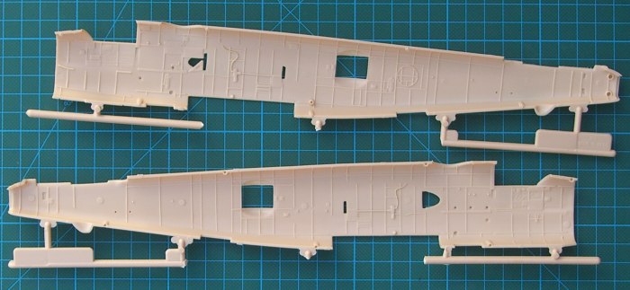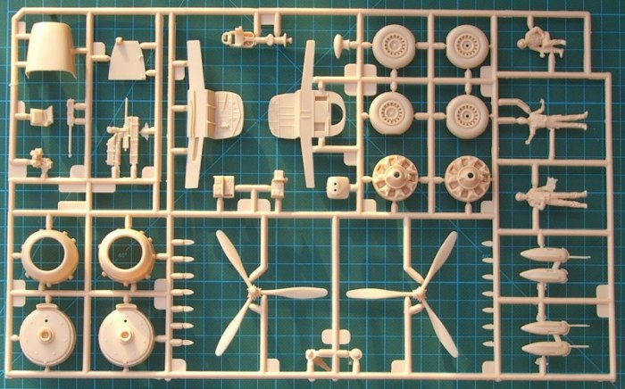 Er hat schon ein paar Jahre auf dem Buckel. An sich ist er nicht schlecht und auch recht stimmig. Er ist mit sehr feinen erhabenen Strukturen versehen. Die beigefarbenen Kunststoffteile sind ansonsten gut detailliert. Es gibt abgeplattete Reifen und auch eine brauchbare Besatzung und die Innendetaillierung geht auch in Ordnung. Die später bei anderen B-25 Bausätzen viel gepriesenen Holme gibt es auch hier. Für Leute die gern das Buggewicht vergessen, gibt es noch eine Einstiegtreppe, die unter die geöffnete Einstiegsklappe am Heck montiert wird.