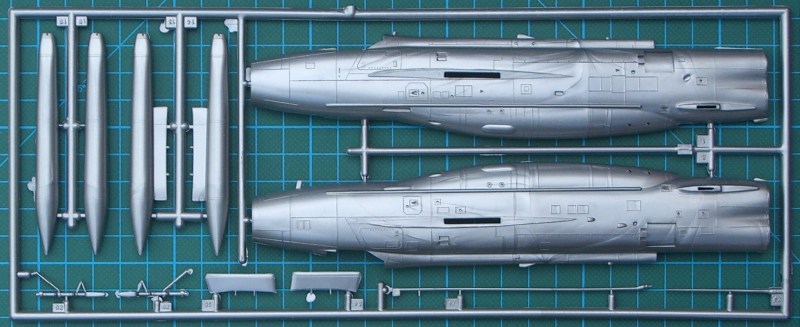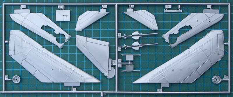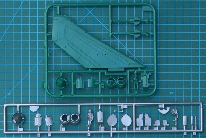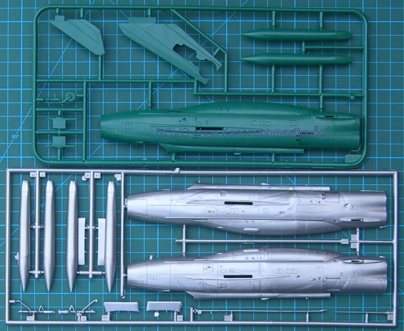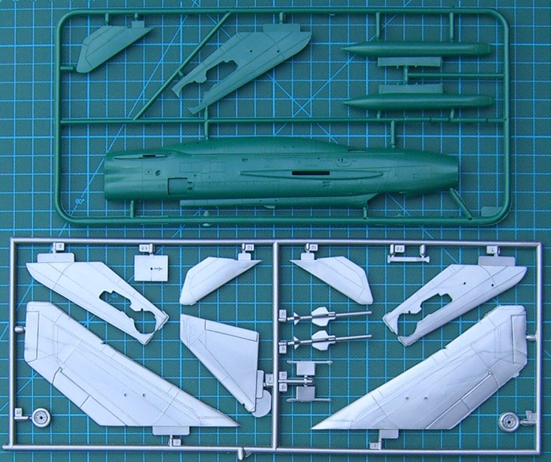 Ich habe mal die Original Frog/Novo-Bausatzteile (grün) mit abgelichtet. Die silbernen Spritzgussteile der BAc sind mit ein wenig Grat behaftet. Der Lufteinlauf ist scharfkantig und der Kegel spitz. Die Pilotenfigur sieht mehr nach einem Außerirdischen aus. Ein Decal für das Instrumentenbrett gibt es leider nicht (Chance vertan). Den Schleudersitz sollte man durch ein vorbildgerechteres Teil ersetzen. Die Luftbremsen können optional geöffnet montiert werden. Aufgrund der fehlenden Details ist das eher nicht empfehlenswert. Ein Lichtblick des Bausatzes sind die Decals und die ordentliche sowie übersichtliche Bauanleitung bzw. Bemalungsanleitung. In Italien wurden die Decals versatzfrei auf hellblauem Trägerfilm gedruckt.