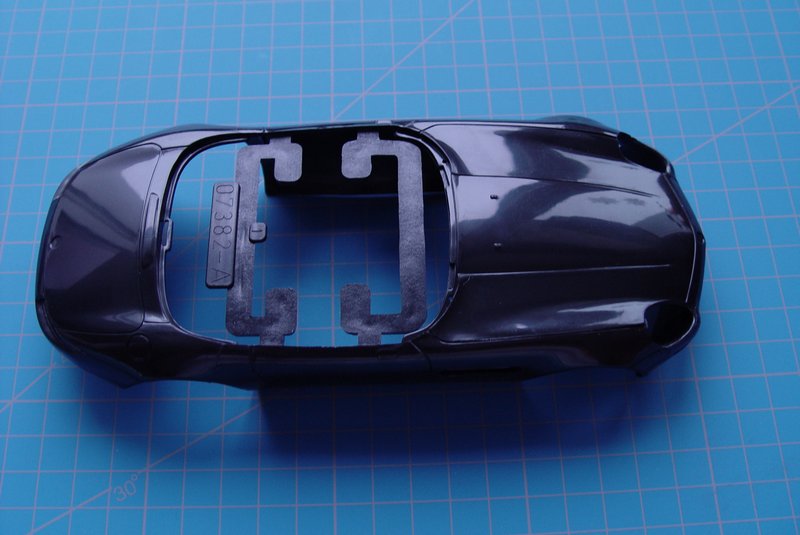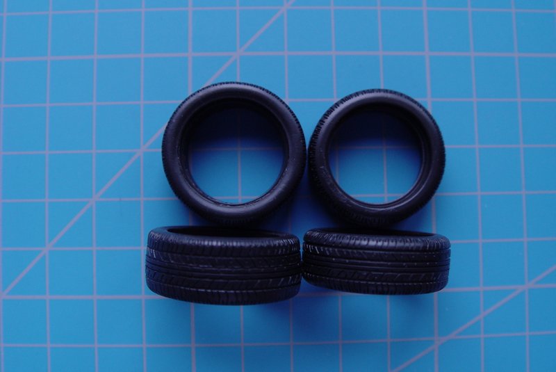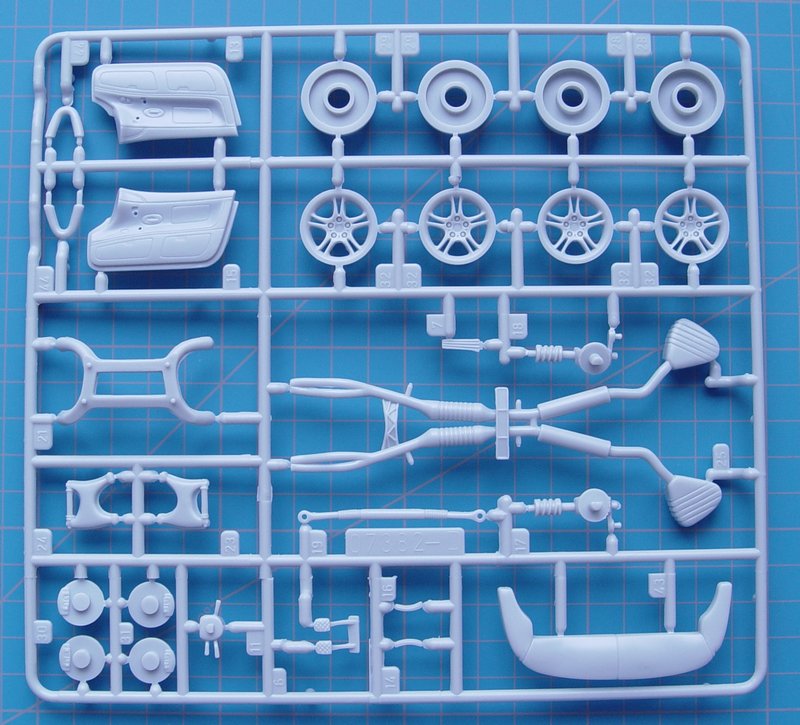 Ein kleiner Bogen mit Chromteilen ist ebenfalls enthalten: für Scheinwerferreflektoren, den Innenspiegel und weitere Kleinteile.Die Felgen sind nicht verchromt, daher müssen sie leider selber lackiert werden. Ein Klarsichtbogen für die Fensterscheiben und Scheinwerfergläser ist enthalten. Das Modell steht später auf vier weiche Vinylreifen, mit Straßenprofil, zwei große für hinten und zwei kleine für vorn.