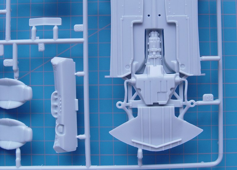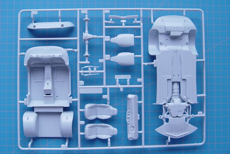 Der Bausatz enthält einen Spritzrahmen im A4 Format, aus grauen gut zu verarbeitenden Kunststoff und einen kleinen Rahmen, im A5 Format. Das Modell ist ein sogenanntes Curbside Modell und enthält keine Motornachbildung. So erklärt sich auch die wenige Anzahl der Bauteile. Für Anfänger ein Vorteil. Der Antriebsstrang ist allerdings nachgebildet.