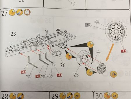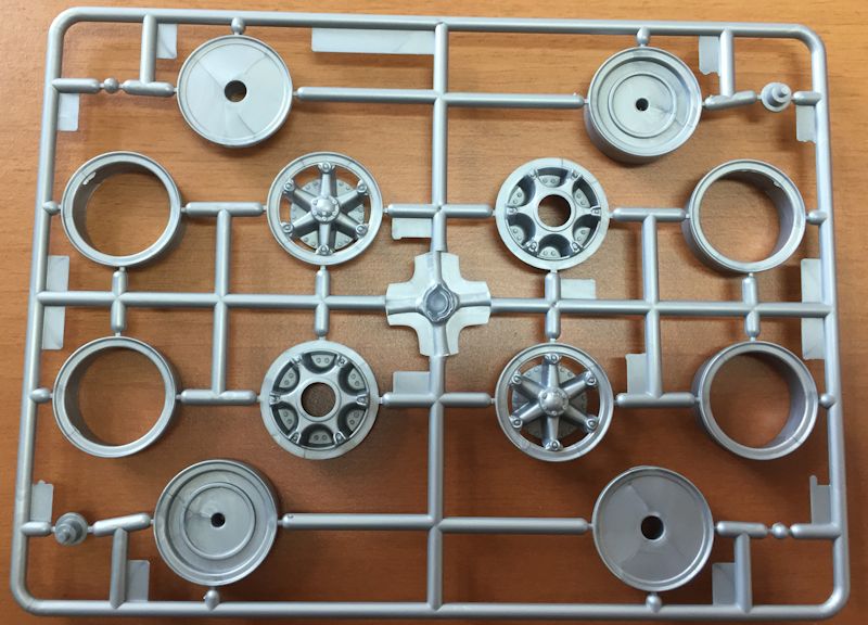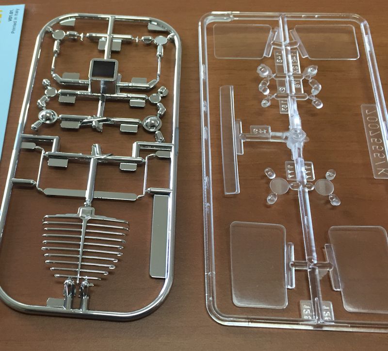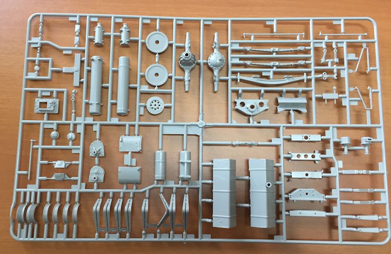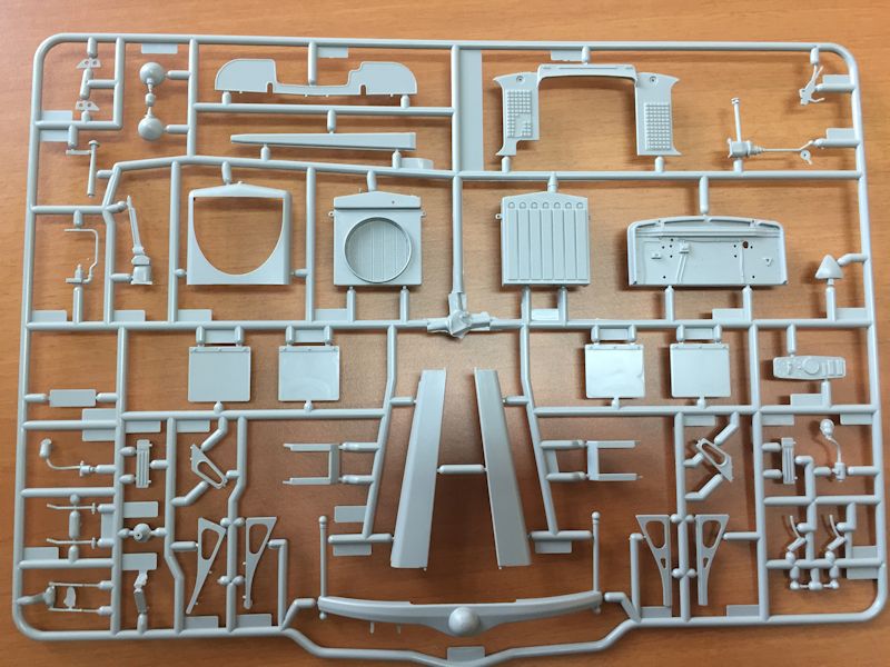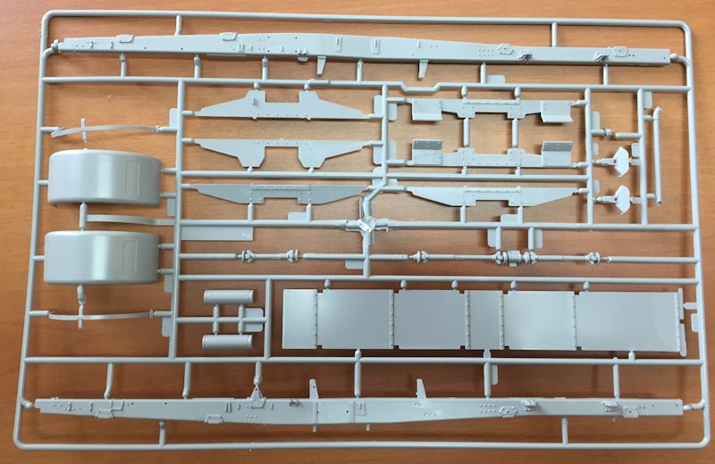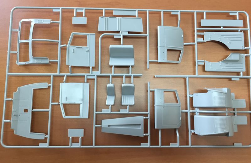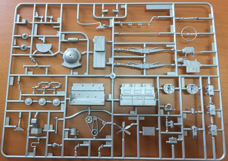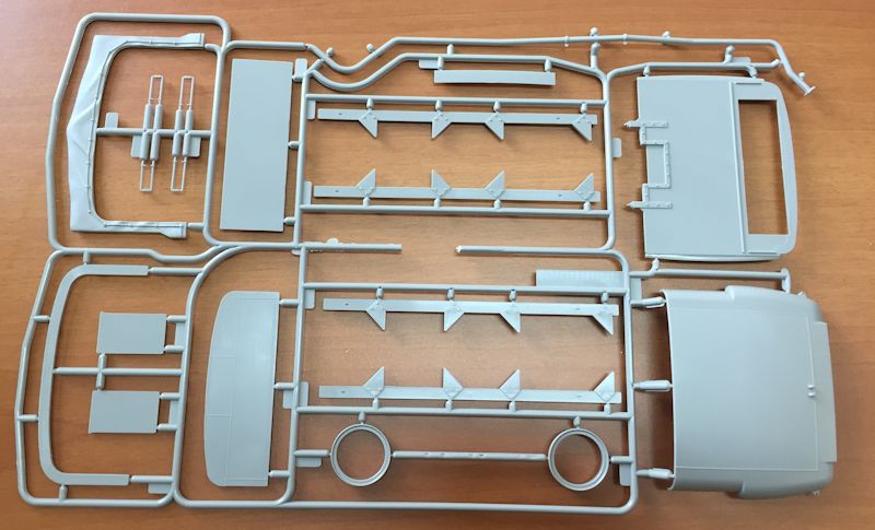 Der Bausatz enthält 10 Spritzlinge, 7 Reifen, einen Spritzling mit Klarsichtteilen, einen mit Chromteilen (insgesamt 303 Teile) sowie einen kleinen Bogen mit Wasserschiebebildern. Die Teile machen einen guten Eindruck. Einige Grate sind schon vorhanden, die jedoch unproblematisch beseitigt werden können. Der Faltenwurf der Plane ist sehr realistisch. Lenkung und Räder sind beweglich, wenn man keinen Klebstoff an der falschen Stelle setzt.