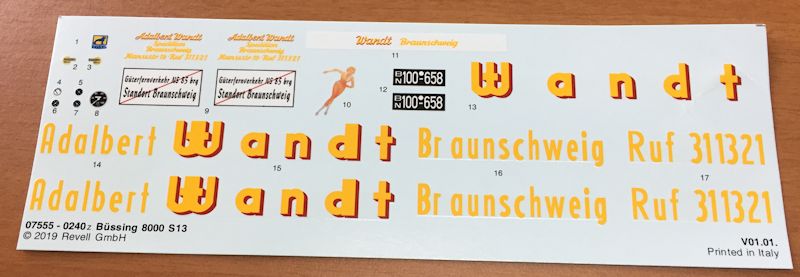 Bausatz: Der Bausatz erschien bereits 1997, 1999 mit Anhänger und andere Decals. 2018 gab es ein Sondermodell als offener Brauereiwagen zu Gunsten der Deutschen Kinderkrebshilfe. Der aktuelle Bausatz entspricht dem von 1997. Die Packung ist nun von oben zu öffnen und nicht mehr der klassische Revell-Seitenöffner. Zudem wird die Länge jetzt mit 37,3 cm angegeben. 1997 waren es noch 37,5 cm. Möglicherweise hat sich die Messtechnik verbessert. Es handelt sich laut Aufdruck um eine "Limited Edition". Die Bedeutung oder die Bedingungen der Limitierung konnten nicht in Erfahrung gebracht werden.