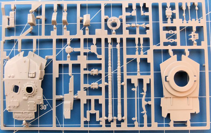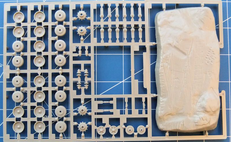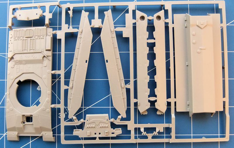 Die Detaillierung der ca. 100 Teile ist insgesamt ausgezeichnet. Es ist alles vorhanden, was das Erscheinungsbild dieses Panzers ausmacht. Nebelwerfer, das Fla-MG, gesondert ausgeformtes Werkzeug, Zugösen und nicht zu vergessen, die Textilummantelung der Kanone, Schön gemacht ist auch die Heckpartie. Die Oberflächenstrukturen können mit jedem moderneren Bausatz mithalten. Auch Staubehälter, (beladen) am Turmheck sind vorhanden. Die Laufrollen sind einfach zu verarbeiten und erfüllen so ihren Zweck.