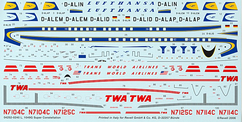 Die Decals liegen noch nicht vor, kommen wohl aber wie üblich aus dem Hause DACO und werden bei Cartograph in Italien gedruckt. Voraussichtlich werden die übliche und fast schon unvermeidliche TWA-Bemalung (wohl bei allen Conny Bausätzen ein Muss) und die Erstbemalung der Lufthansa aus dem Jahre 1955 enthalten sein.