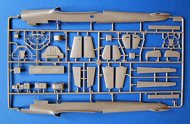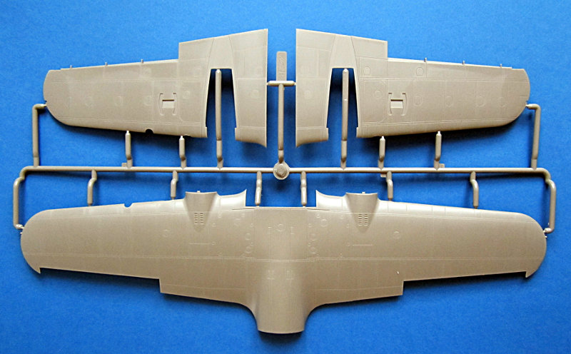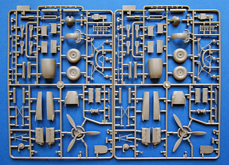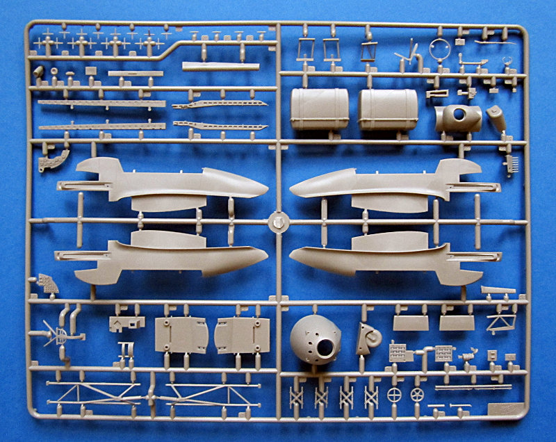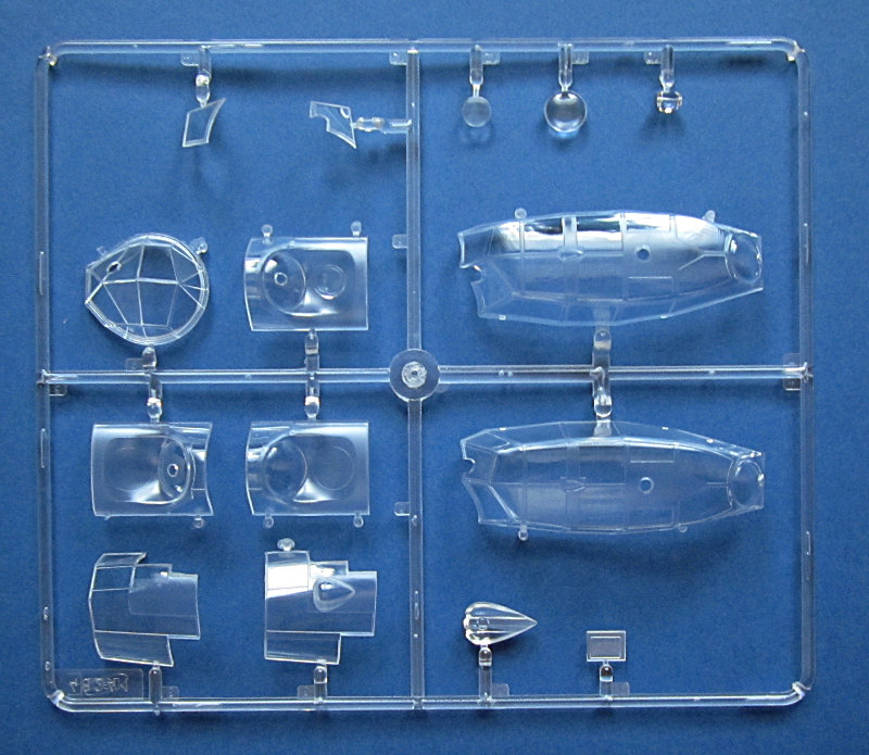 Die Hauptfahrwerkschächte sind etwas vereinfacht und haben ein paar Auswerfermarken. Nach vorne schließt ein Brandschott mit Motoraufhängung und DB 601 an. Die Motorgondel ist mehrteilig und könnte somit auch offen dargestellt werden. Eine weitere Detaillierung des Motors, Kühlers und das Motorraumes sind in diesem Falle aber zu empfehlen. Die Verstrebungen der Fahrwerksbeine und insbesondere die Schutzbleche machen einen sehr guten Eindruck, während die Räder durchaus etwas überarbeitet werden können (auf jeden Fall etwas abflachen). Propeller und Spinner wirken am Spritzling etwas einfach (nur zwei Teile). Die Klarteile sind dünn und schlierenfrei und haben augenscheinlich die richtige assymmetrische Form. Etwas ärgerlich ist allerdings der Ausschnitt für das Spannervisier, welches man für die Do215 nicht braucht. Es wird zwar die Panzerscheibe davorgeklebt, aber der Ausschnitt bleibt sichtbar. Ich werde wohl vorsichtig die ganze Scheibe heraussägen und dann die Panzerscheibe davorsetzen... mal schaun.