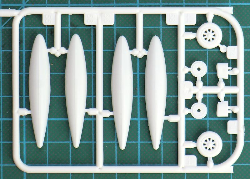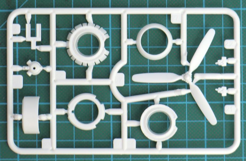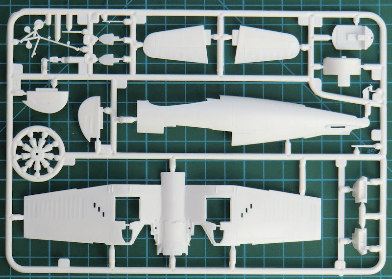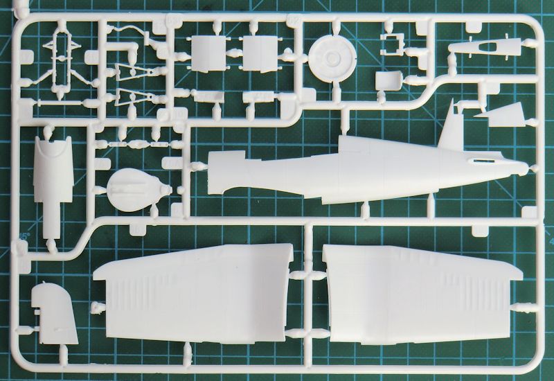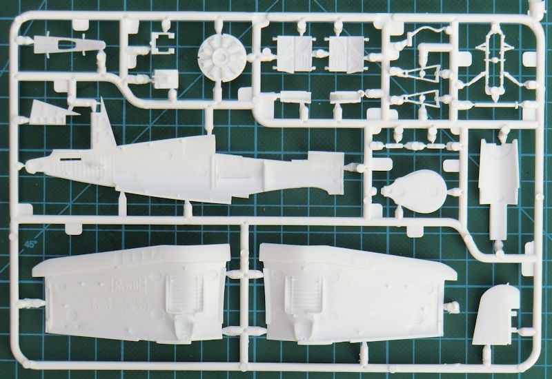 Höhen- und Seitenruder haben auch scharfe Hinterkanten. Der Motor entsteht aus drei Teilen. Ich persönlich finde die Darstellung des R-2800 etwas vereinfacht. Das habe ich bei Revell aus der Kiste schon besser gesehen. Alternativ kann man die Kühlluftklappen offen oder geschlossen darstellen. Das Heckfahrwerk besteht aus einem Stück. Die Felgen der Hauptfahrwerksräder sind durchbrochen. Auch ansonsten hat Revell es beim Hauptfahrwerk gut gemacht. Als Option gibt es zwei Abwurftanks. Die Kanzel besteht aus zwei Teilen. Das hintere Stück kann man lt. Bauanleitung in geöffneter Position fixieren.