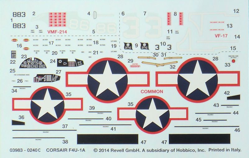 Bausatz: Als Neuheit des Jahres 2014 erschien nun bei Revell die Vought F4U-1A Corsair in 1/72 als zeitgemäßer Bausatz. In der unpraktischen Schüttbox befinden sich gut verpackt vier weiße Spritzlinge mit 61 Teilen, ein Klarsichtrahmen mit zwei Teilen, einen Decalsatz und die typische Revell-Bauanleitung. Die Bauteile sind sauber abgespritzt und haben feine Details. Mir persönlich gefällt der Aufbau des Bausatzes. Daraus kann man ableiten, dass bei Revell weitere Versionen geplant sind. Die für den Maßstab 1/72 etwas übertriebene Stoffstruktur gefällt mir allerdings nicht. Auch die Leute bei Vought hatten in den 1940er Jahren schon Spannlack zur Verfügung mit dem der Stoff gespannt wurde. Im Original waren solche Vertiefungen, wie sie der Bausatz zeigt, kaum möglich. Sichtbar wird der Stoff nur gegen die Sonne da dann das Licht durchscheint! Also wer sich daran stört, der sollte die Vertiefungen mit Flüssigspachtel abschwächen.