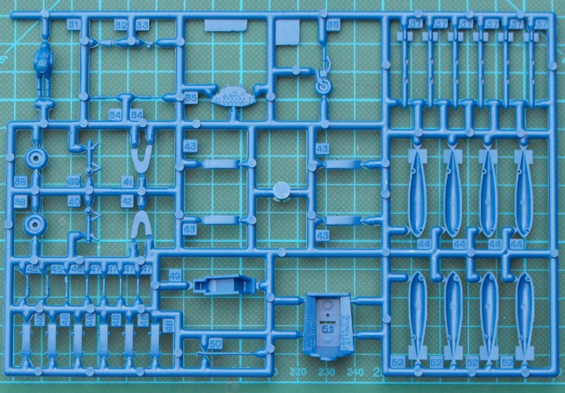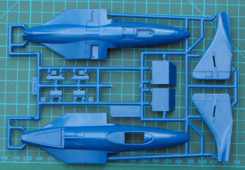 Einige Strukturen sind aufgesetzt und einige sind versenkt. Insgesamt mach es alles einen leicht vereinfachten Eindruck. Das Cockpit besteht aus einer Wanne mit strukturierten Instrumenten, dem Instrumentenbord, einem klobigen Schleudersitz und einem Piloten. Der Zusammenbau der wenigen Teile drüfte auch Anfänger nicht vor Probleme stellen. Wichtig ist jedenfalls das Buggewicht nicht zu vergessen. Die Fahrwerksschächte und das Fahrwerk selbst sehen stark vereinfacht aus. Gleiches gilt auch für die Bewaffnung.