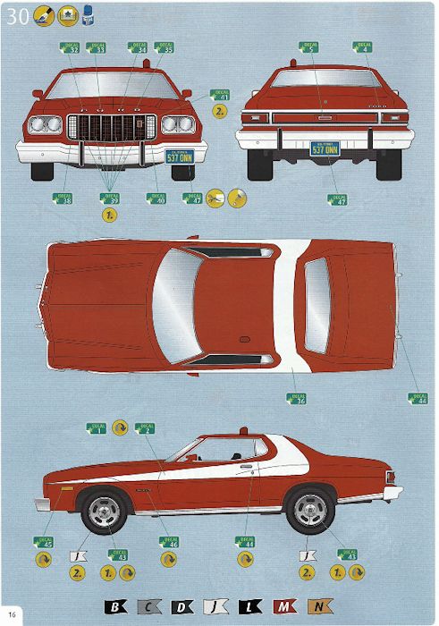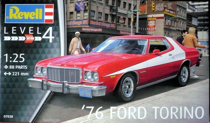 Bausatz: 2015 erschien erstmalig durch Revell-USA der 76er Ford Torino "Starsky & Hutch" im Maßstab 1:25 für den amerikanischen Markt. Zwei Jahre später können wir Europäer diesen Bausatz in einer etwas anderen Verpackung im Fachhandel beziehen.