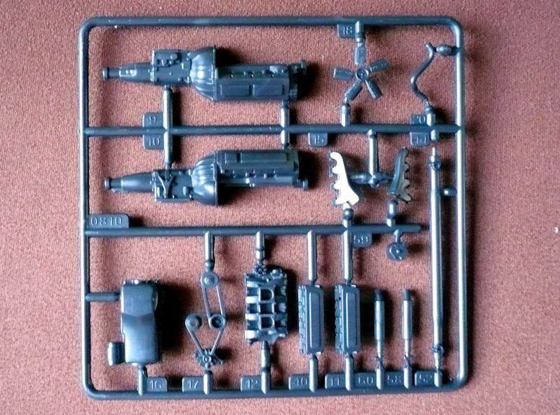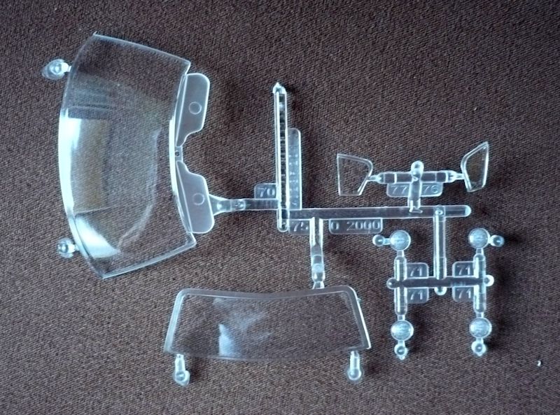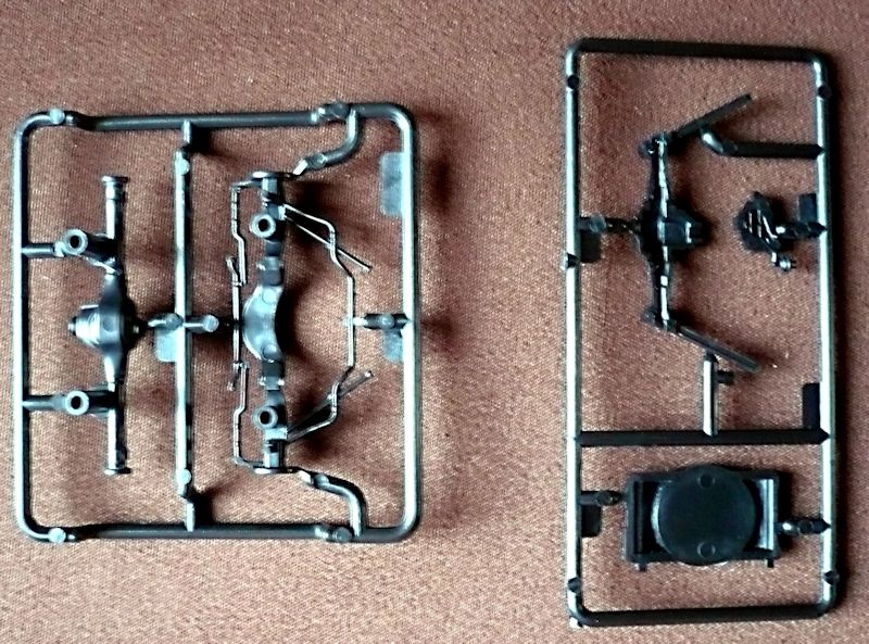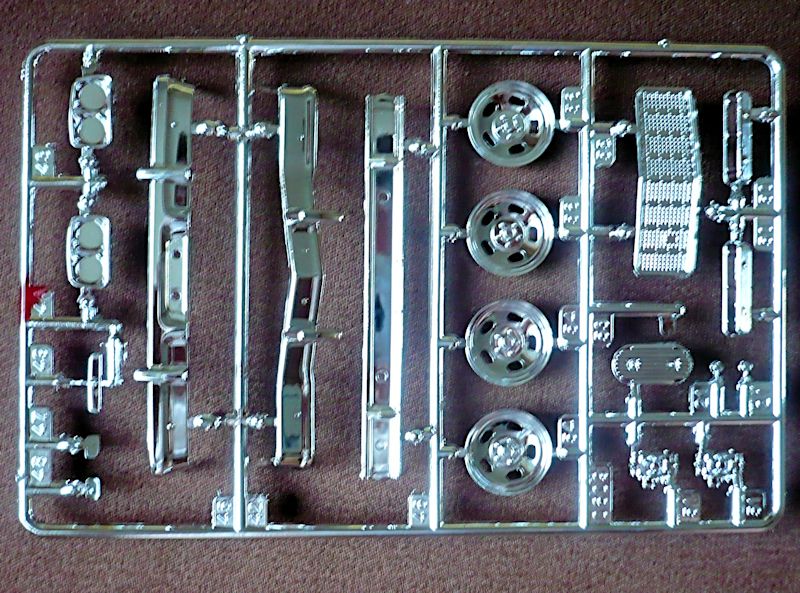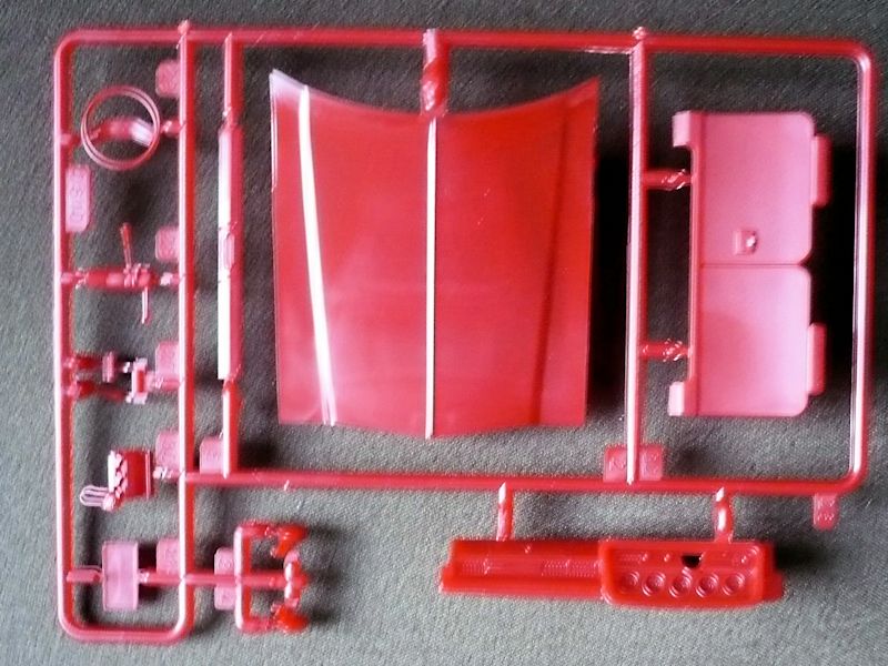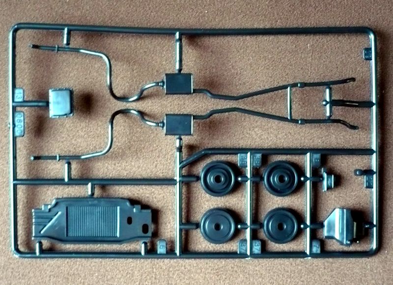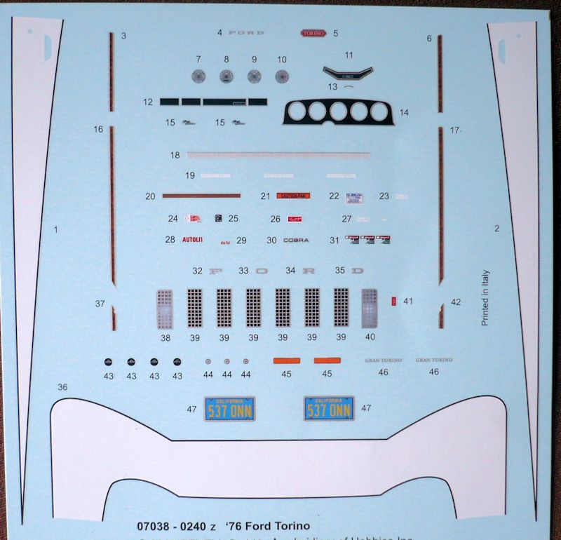 Der Torino besteht aus 88 Bauteilen, verteilt auf 10 Spritzlinge, der Karosserie und dem Chassis als Einzelteile , vier Vinylreifen, vier Metallpins für die Radbefestigung - sie haben leider in meinem Bausatz gefehlt und einem Abziehbilderbogen.