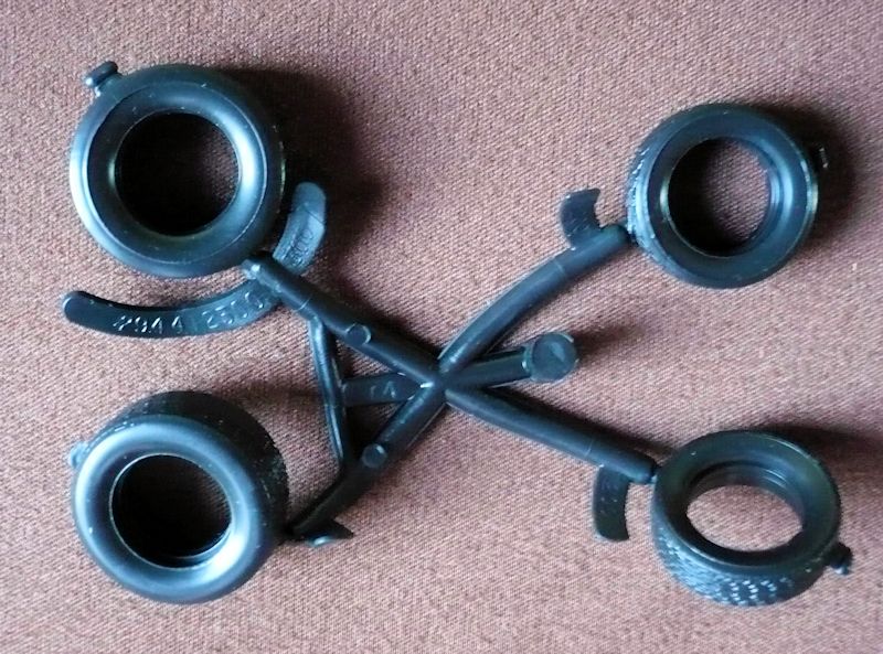 Die Bereifung - aus weichem Vinylmaterial- weist ein feines Profil auf aber keinen Reifenhersteller. Die Reifen fallen durch unterschiedliche Breiten für vorn bzw. hinten auf. Die Materialstärke der Klarsichteile fällt zufriedenstellend aus. Die Rückleuchten und die zusätzlich aufsetzbare Police-Rundumleuchte sind im transparenten Rot gespritzt.