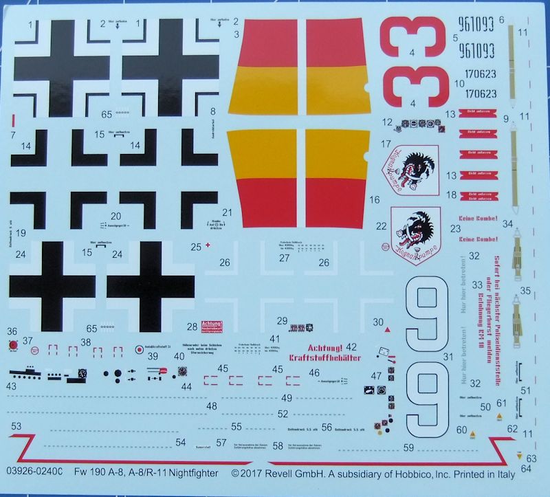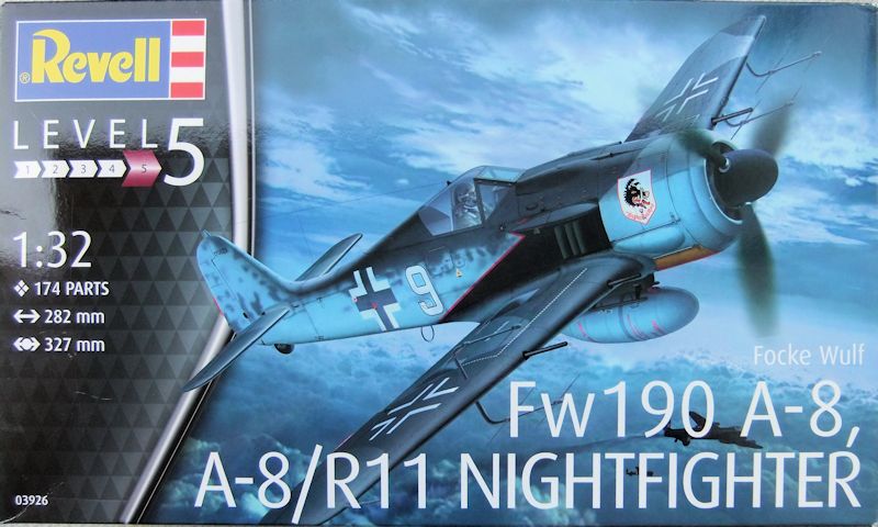 Bausatz: Der Bausatz in dem typischen Faltkarton von Revell besteht aus über 175 Teilen. Diese bieten auch alles, was man von einem modernen Modell in diesem Maßstab erwarten kann. Die recht unbekannte Variante der Nachtjägerausführung basiert auf der vor zwei Jahren herausgebrachten Fw 190F. Sie ist unter den zahlreichen Untertypen des Jagdflugzeuges eine wirklich interessante Wahl. Wie auf der Packung zu ersehen, kann man natürlich auch einen Standardjäger Fw 190A-8 aus dem Bausatz bauen.
