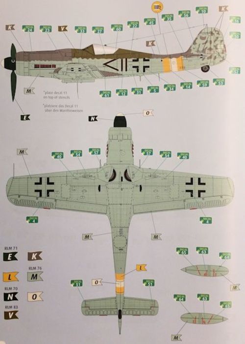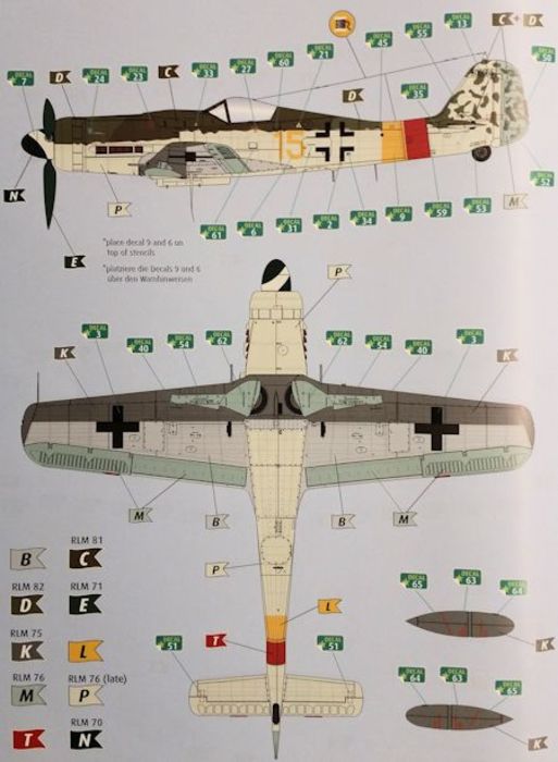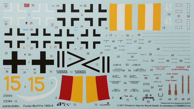 Bemalung: REVELL hat sich zwei Maschinen der Luftwaffe aus dem Jahr 1945 zum Vorbild genommen. Dies ist erstens die Gelbe 15 mit der Werk-Nr. 500666, die im Mai 1945 beim II. / JG 301 in Erfurt-Nord stationiert gewesen sein soll. Zweitens ist es die Werk-Nr. 210194, welche im Januar 1945 in Aachen beim I./ JG 2 in Aachen zum Einsatz gekommen sein soll.