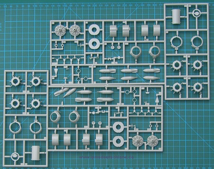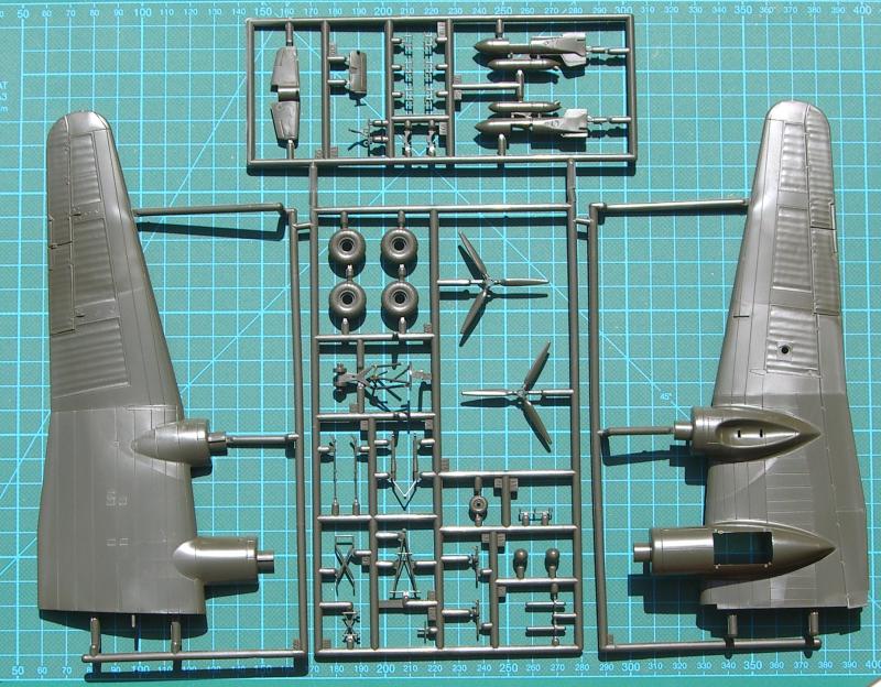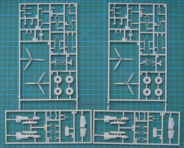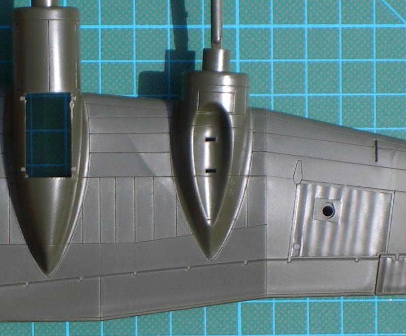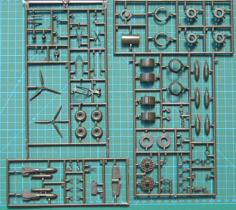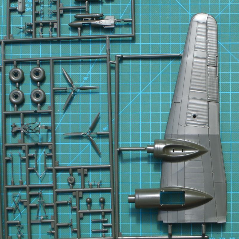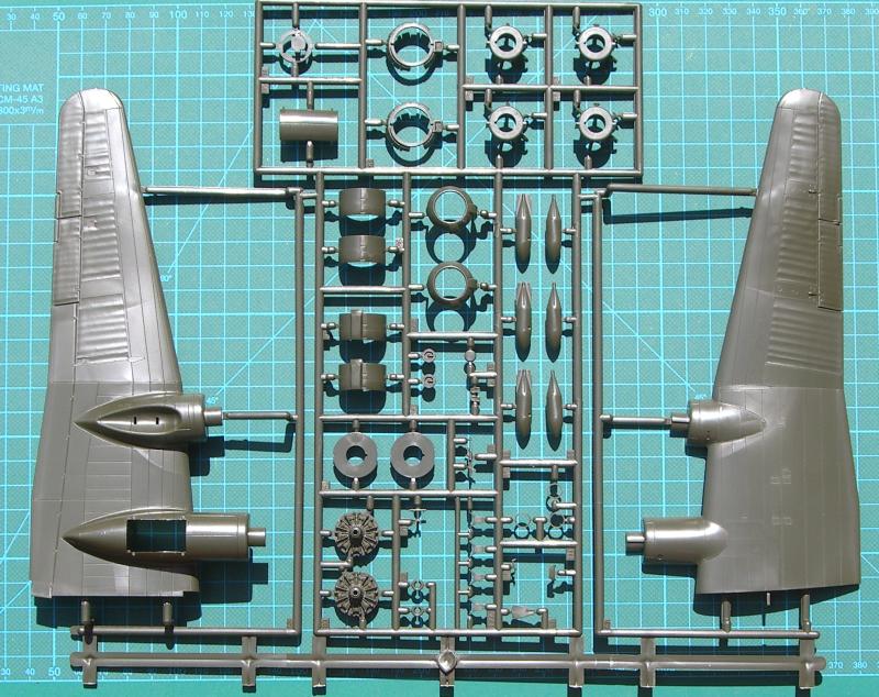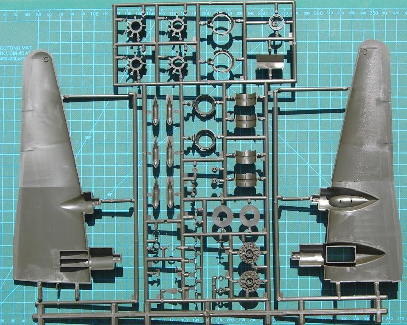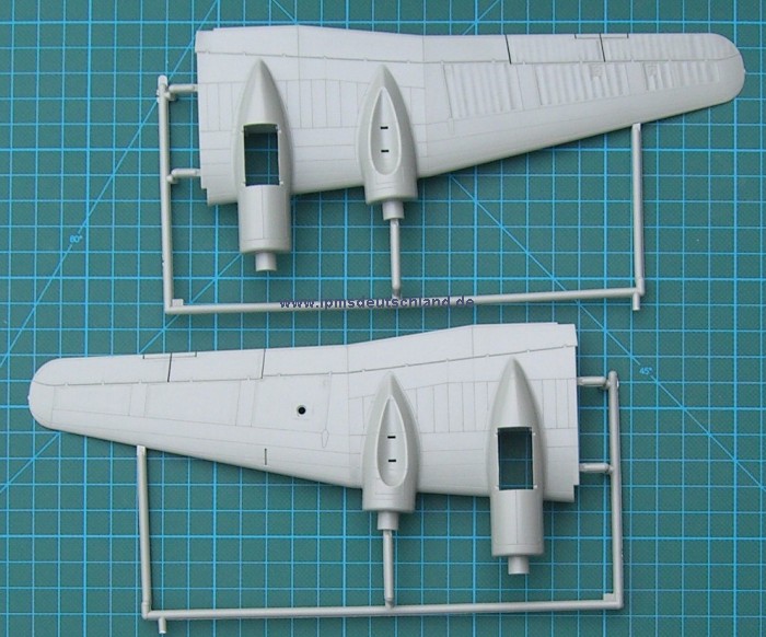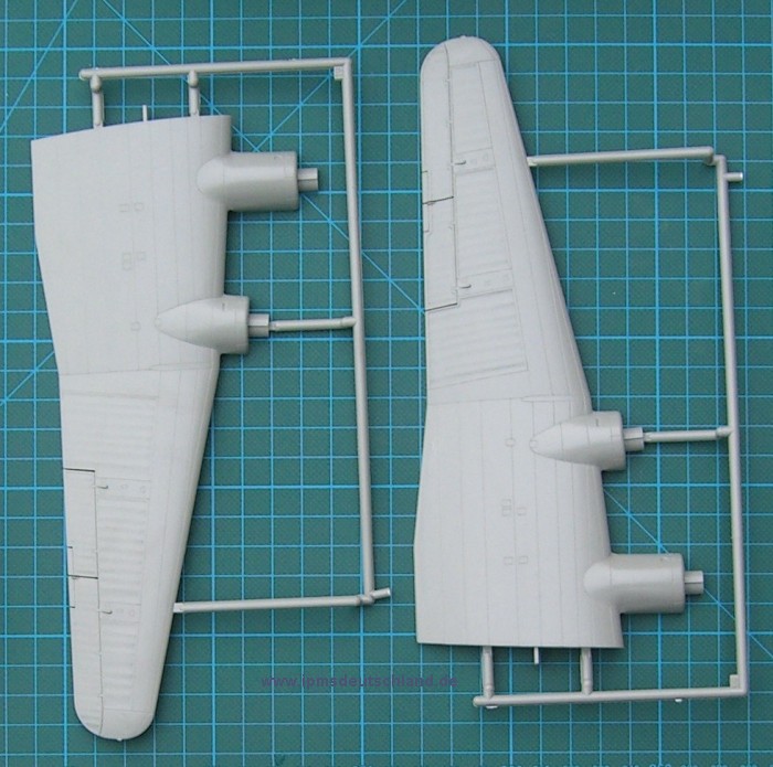 Die Motorgondeln sind komplett an die Tragflächenteile angespritzt und die Ausrichtung der äußeren Gondeln ist perfekt. Die Triebwerke mit samt den Hauben sind durch die Vielzahl der Bauteile perfekt detailliert. Wer die Motorhauben geschlossen lässt, der muss hier nichts weiter tun. Das Teil mit den Kühlluftklappen liegt separat bei und dadurch lassen sich messerscharfe Hinterkanten realisieren. Die Propeller sind in der Form gut getroffen. Für die Abgasrohre gibt es zwei verschiedene Ausführungen, die dem Bausatz beiliegen.